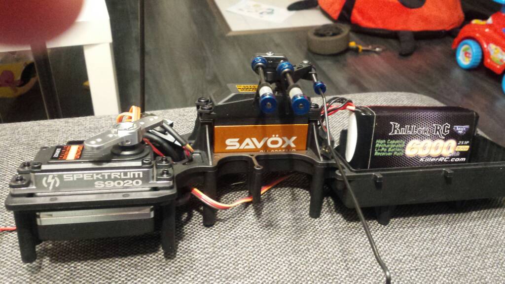 Lite bakslag: skruvarna till orginal länkage är på tok för grova för dubbelhornet jag köpte. Kan förstås använda smalare skruvar men då blir det glapp i länkaget eller borra upp hålen i hornet men det försvagar nog rätt mycket med tanke på dubbelhornet (vet ej märke, uber rc?) är förvånansvärt klent*[FEARFUL FACE] från början , klenare än orginal. Därmed kan jag inte utan att beställa annat horn använda dubbla länkage till den 2armade servoräddaren. Blir standard länkaget istället som dock enl en tråd på amerikanska 5ive forumet ska funka bra med detta servo. Passar också på att ge losi en känga för den minimala radiolådan där det krävs tetriskunskaper på hög nivå för att få in mott, killswich, kablar (inkl den grova servokabeln samt y kablage). Det tog ett bra tag. Varför i hela friden ska en nästan 1 m lång och 55 cm bred rc bil ha en radiolåda som knappt rymmer en liten tändsticksask?