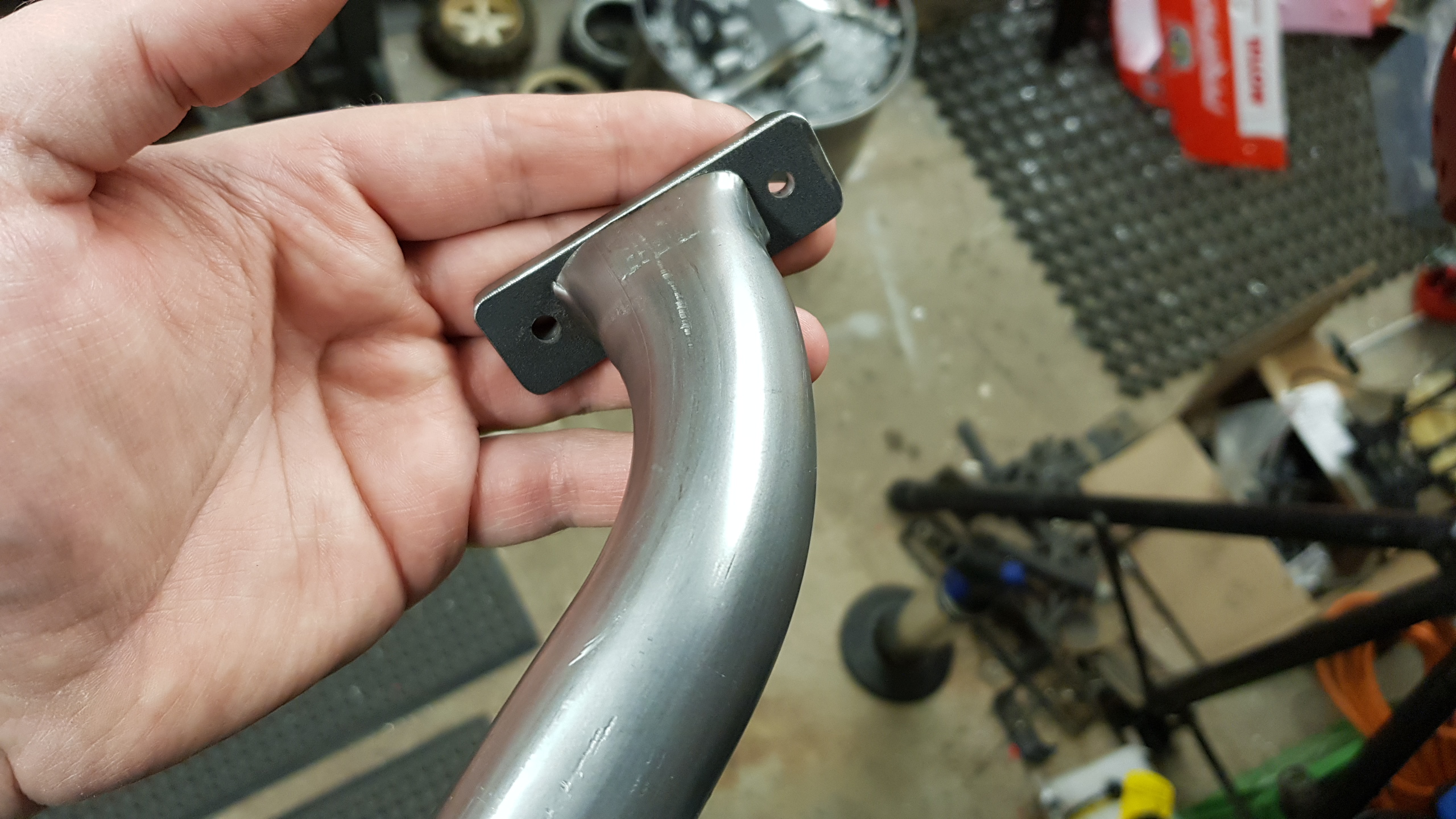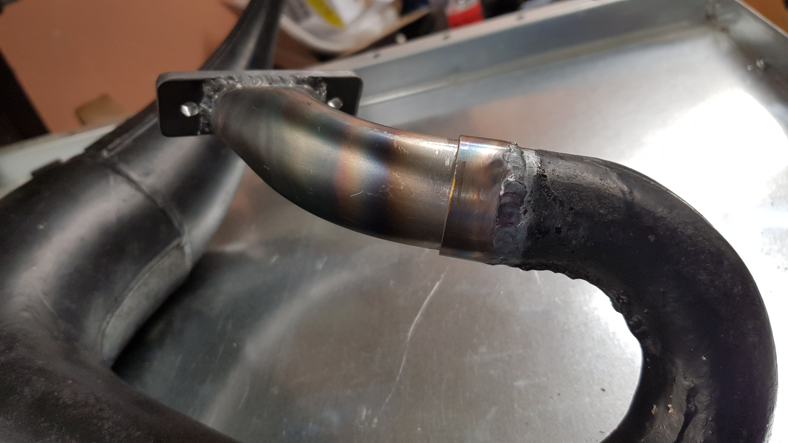 Fräste ur en avgasfläns och bankade på några rörbitar innan det var dags att svetsa.