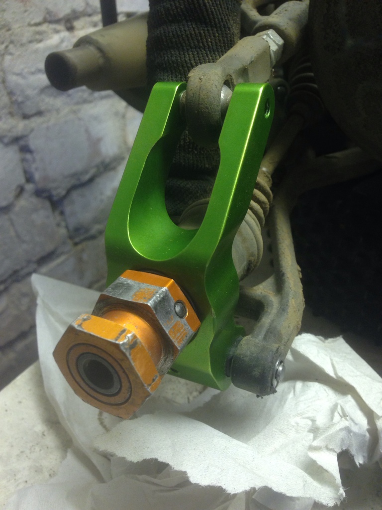 Då va det dax att redogöra vad som gick sönder i sandhem. Övre länkarmen bak höger sida har gängar fått ett imponerande glapp men håller ännu. Övre länkarmen bak vänster sida har "gängstången" krökts bakåt.