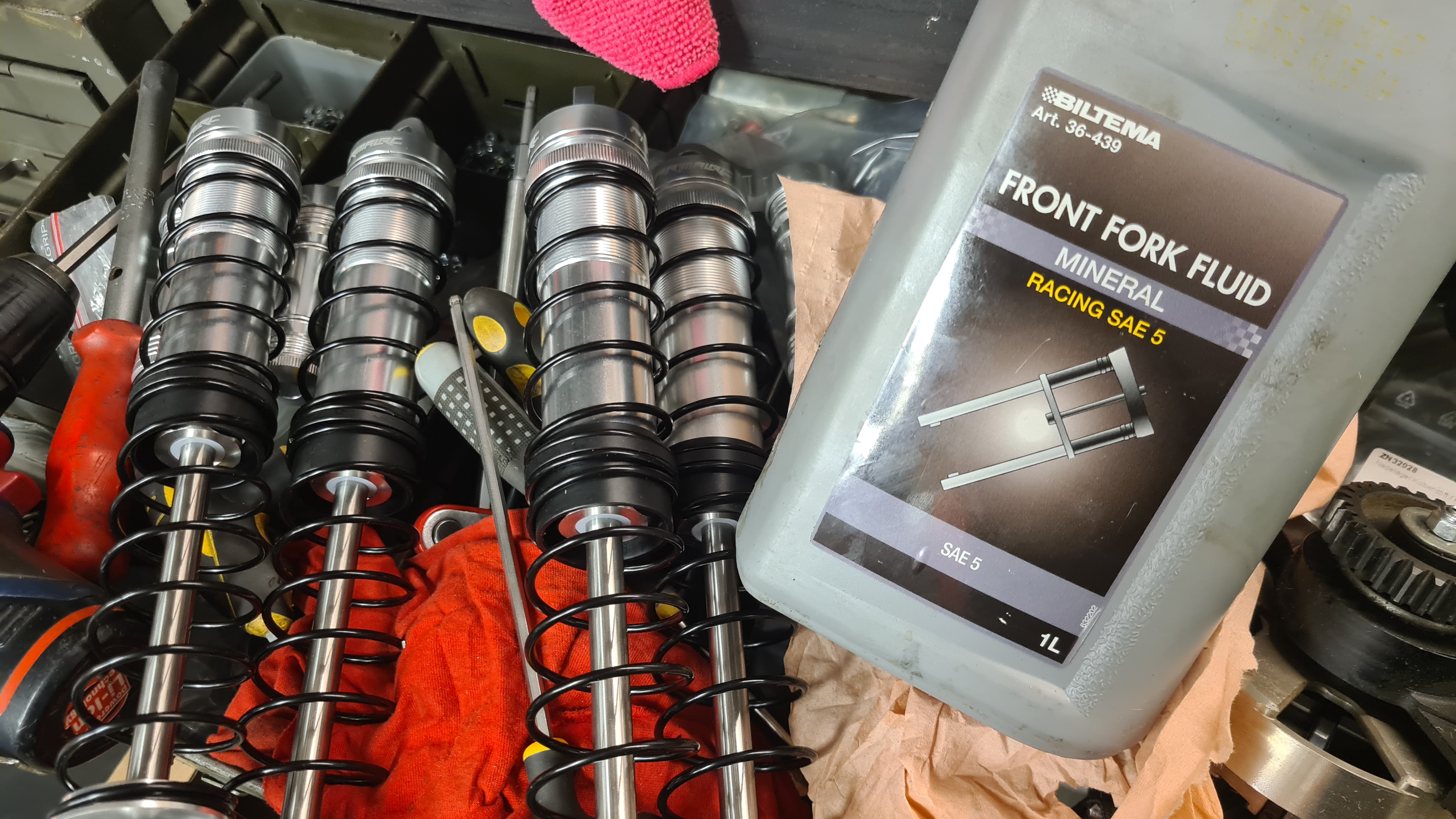 Dels för att jag vill ha så tunn olja som möjligt, och dels för att få så snabb transport av oljan som möjligt inne i kanalerna på dämpare/piggyback.