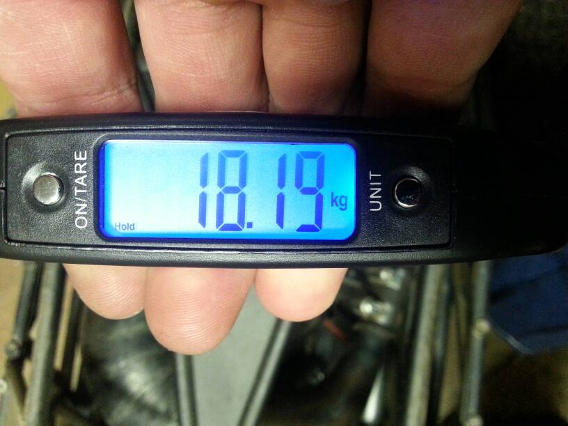 Vägde in den i klassen "Korpulent DeLuxe" och vågen stannade inte förrän den passerade 18kg.....med tom tank....