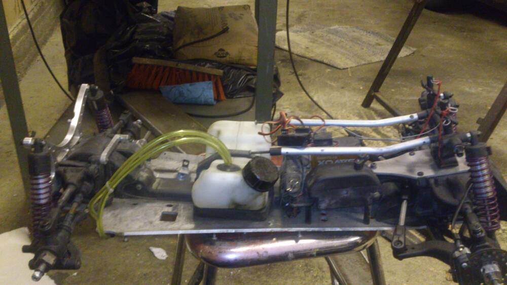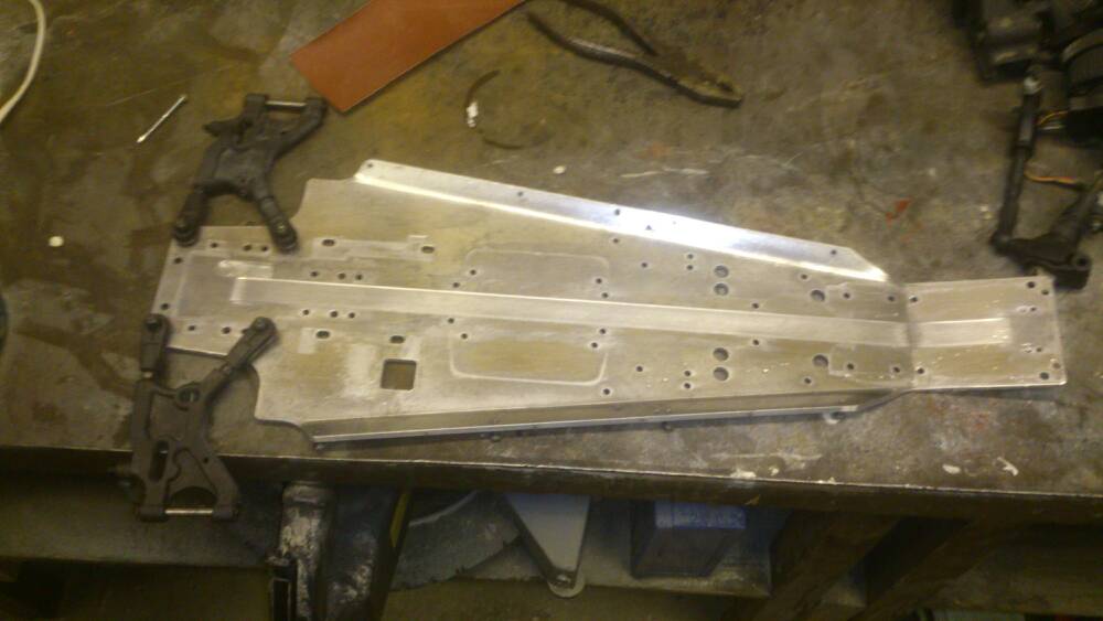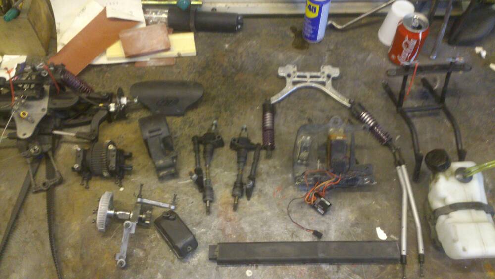 Rivandet är färdigt. Bottenplattan rengjord och bilen i delar. Remmen var i mycket gott skick, vet ej om dom brukar förbrukas. Plattan var lite skev i ena hörnet bak men det är inget jag tänker bry mig i då det var så lite. Blir till å beställa en radioplatta i alu, en kolvstoppare, en ny koppling då jag ingen hade, lite outerwearz och ett extra servo till att kunna köra fram och bakbroms separat. Hade isär diffarna och kikade och det såg bra ut men en ny bakdiff hade ju varit trevligt, får se hur långt finanserna räcker :-)