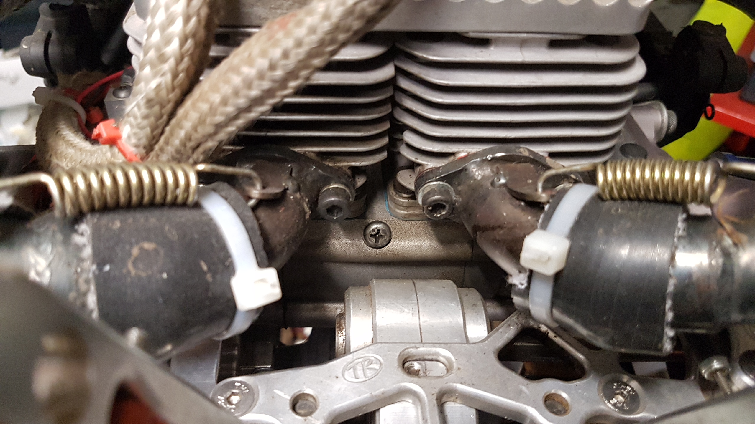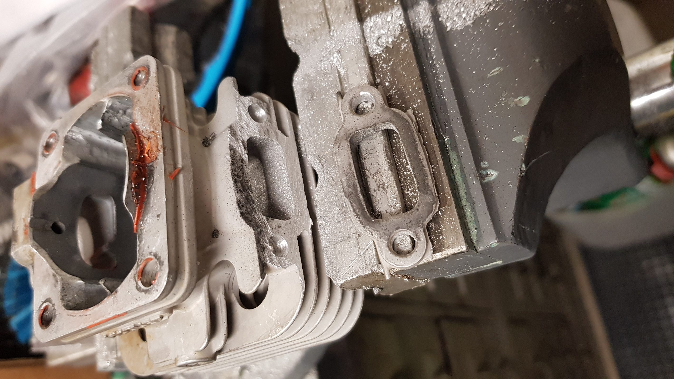 Ett par gamla cylindrar fick donera avgasportarna som jag kapade och slipade i rätt vinklar för att kunna vrida in piporna under buren utan åverkan alls.... förutom på ena cylindern som jag fick frisera kylflänsarna på några mm.