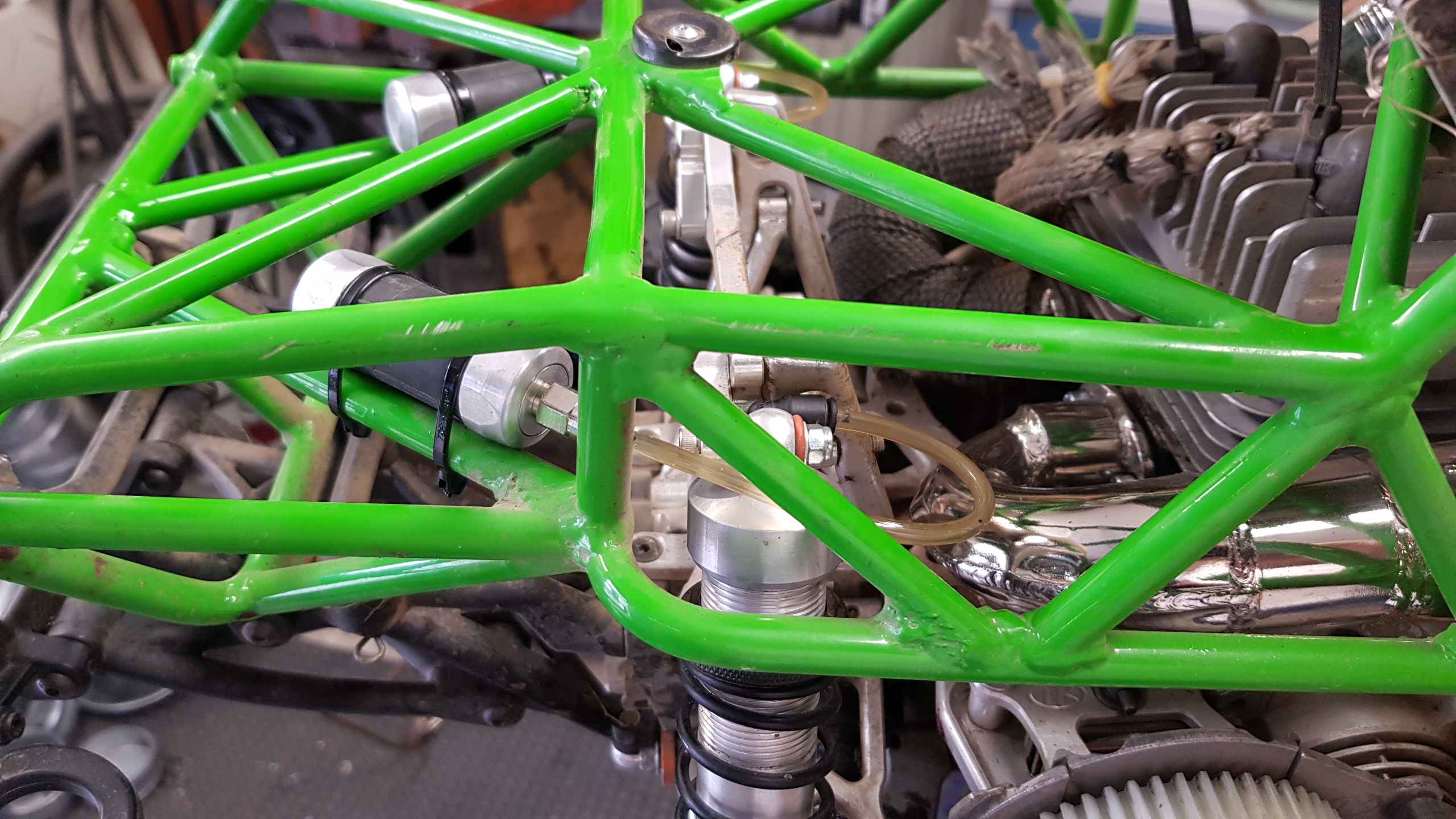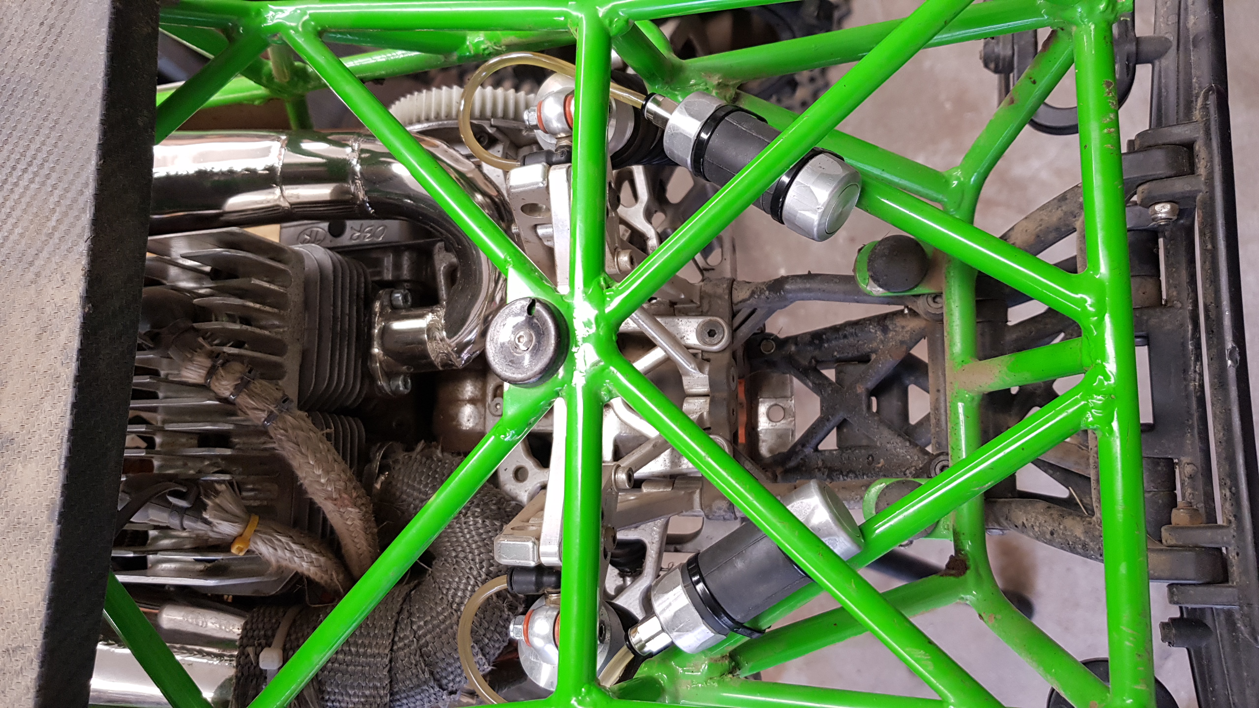 Har ju egenbyggda rezzare på den, och under en bakhjulsåka i hög fart där ett gupp gjorde att bilen slog ett frivarv framlänges, sköt den av båda slanganslutningarna till båda ressarna fram.