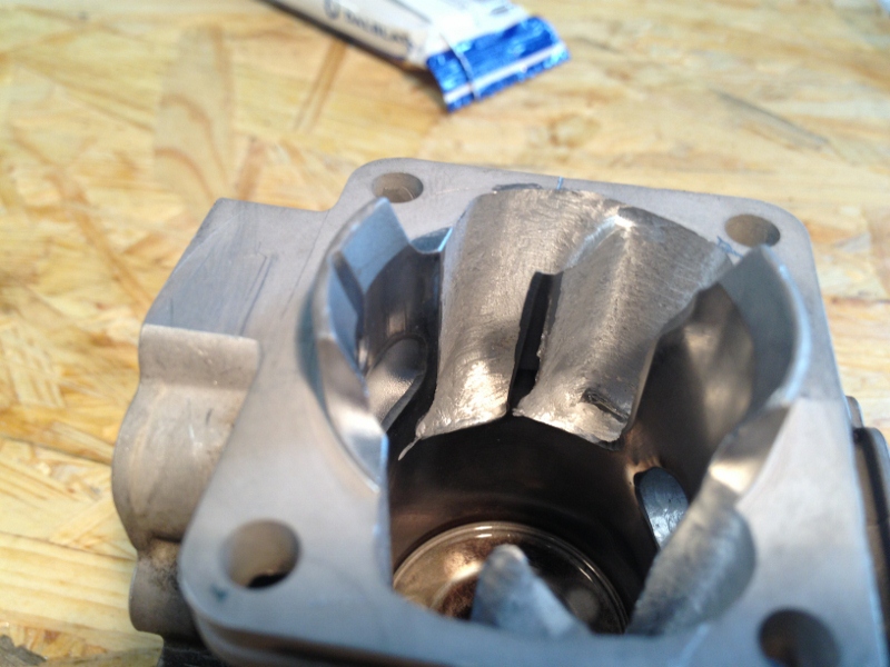 Först var det formen på utblåset. Började med bara ett 6mm jack till 180grader utan att röra övrig port, dvs övriga taket låg på ca 170 grader. Sedan höjde jag taket med liten rundning och gjorde bara ett litet jack (180grader på tak och 185 på jacket). Insug är på 152 (orört) och kanalerna på 112(orört)/132 med lite uppåtriktade ögonbryn på dom mot insuget på samma sätt som Hobbycenter gör.