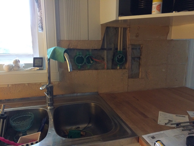 Sågat upp väggen förr få bort gammalt kakel och ta bort dosorna