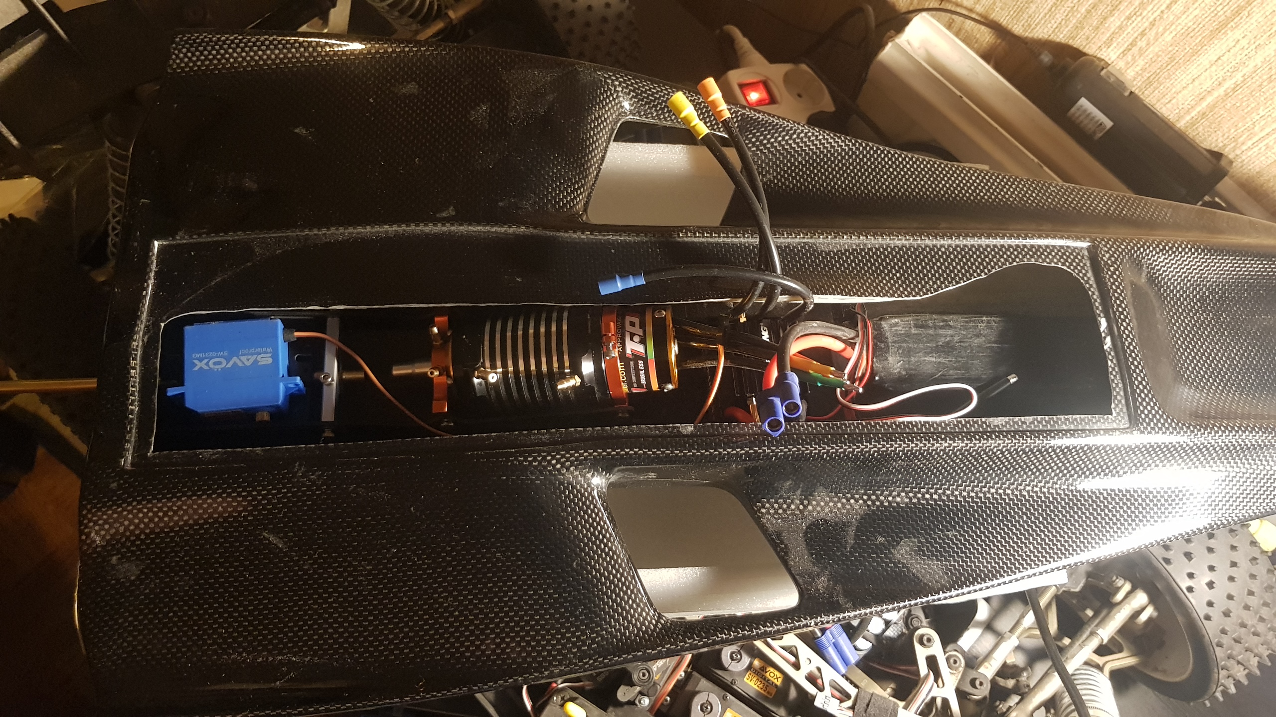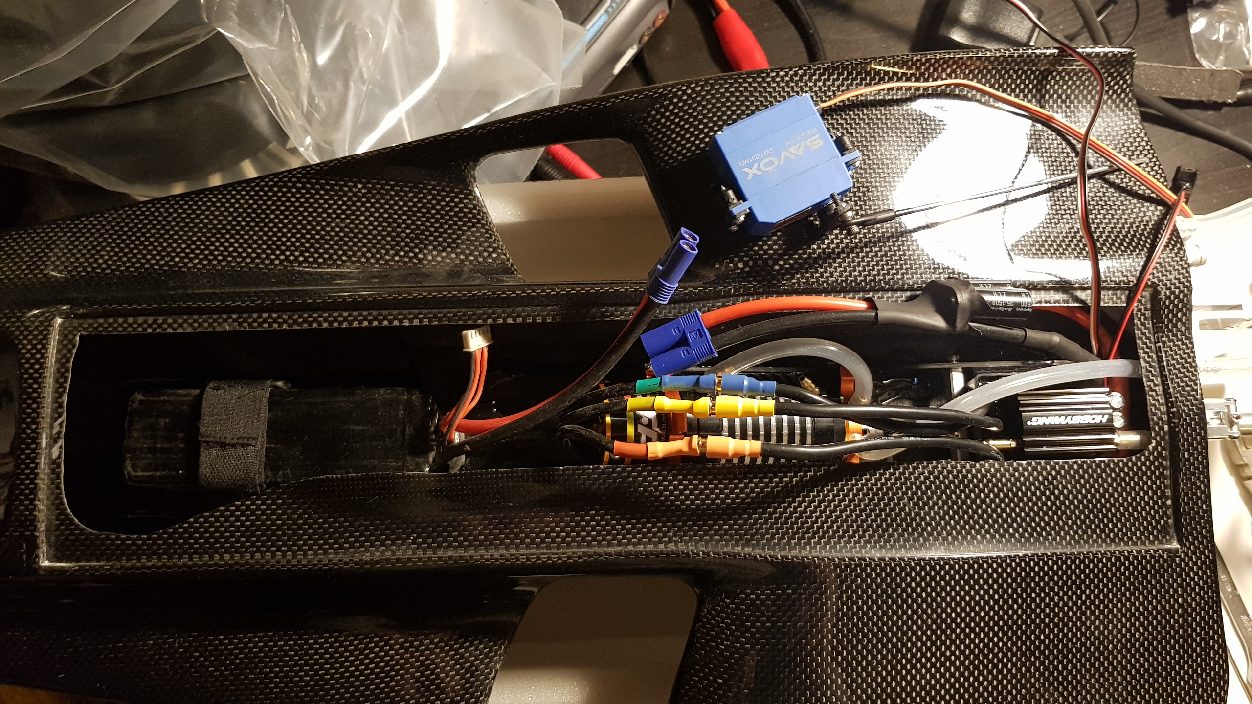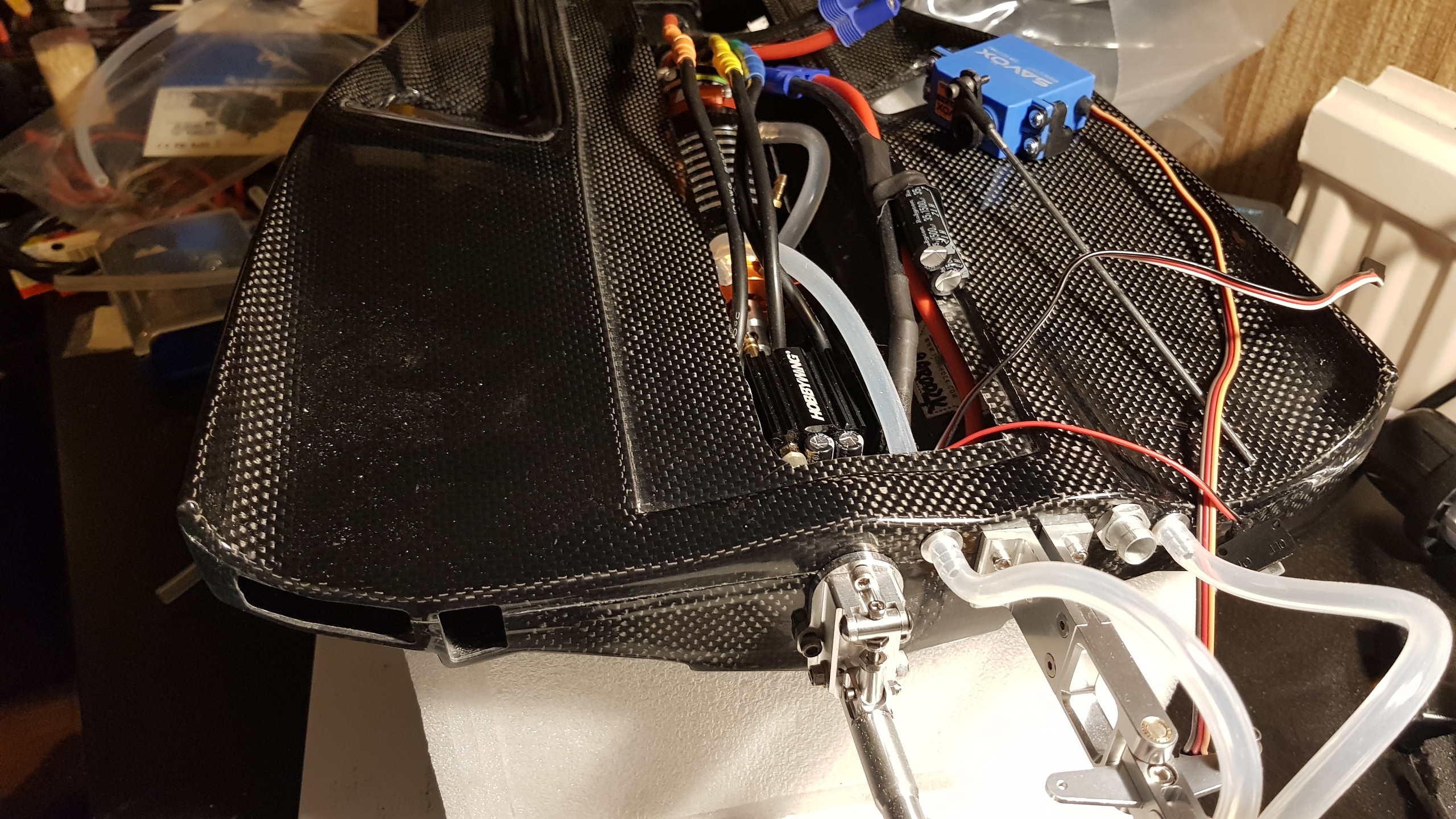Inte mycket plats där bak. Fästa servot, i med mottagaren, utloppen till vattenkylningen, en drös buntband sen borde den nog gå. Just ja, får se vilken av de olika sätten att fästa luckan som jag ska köra på. Har basic, tejp, basic tumskruvar och lite fräsigare modell som nog inte går, den där vändkammaren stjäl massor med plats. Fick förlänga kablarna mellan esc och batteri. Ville ha bak esc för cog kom på tok för långt fram.