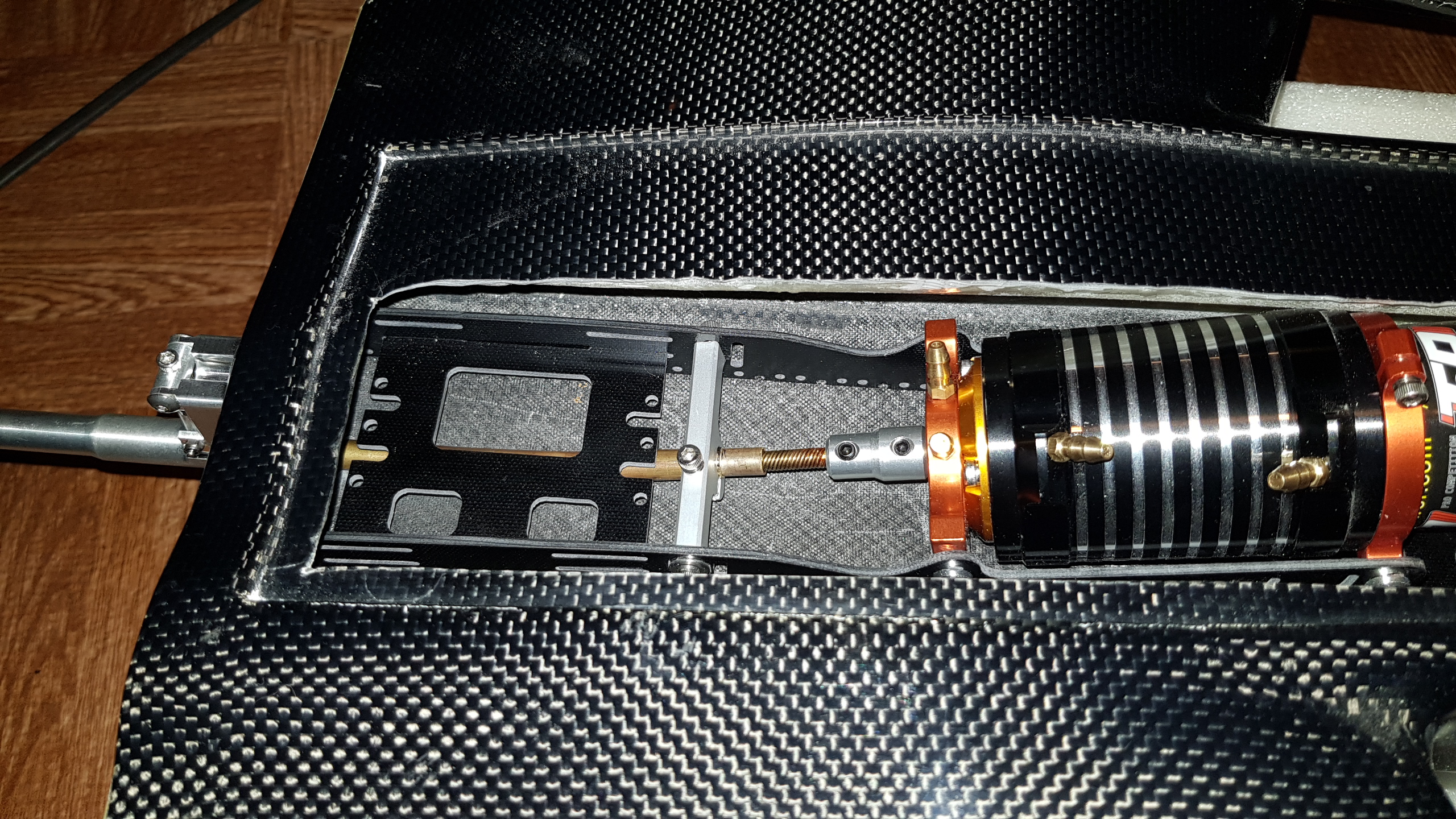 Hade köpt på mig en massa axlar, roder/stinger kombo osv i storlek 1/4" för en vass 40mm motor. Det blev för mycket så la undan den ett tag men har nu skaffat mer lämpliga saker för 3/16" axel, dock fortfarande för 40mm motor. Tanken är att få köra den med en tp 4070 1090kv motor på ett seaking 180a esc. Esc ska klara 8s, dock ändrar 2st 4s cg väldigt mycket så tänkte nöja mig med 4 och 6s i början åtminstånde.