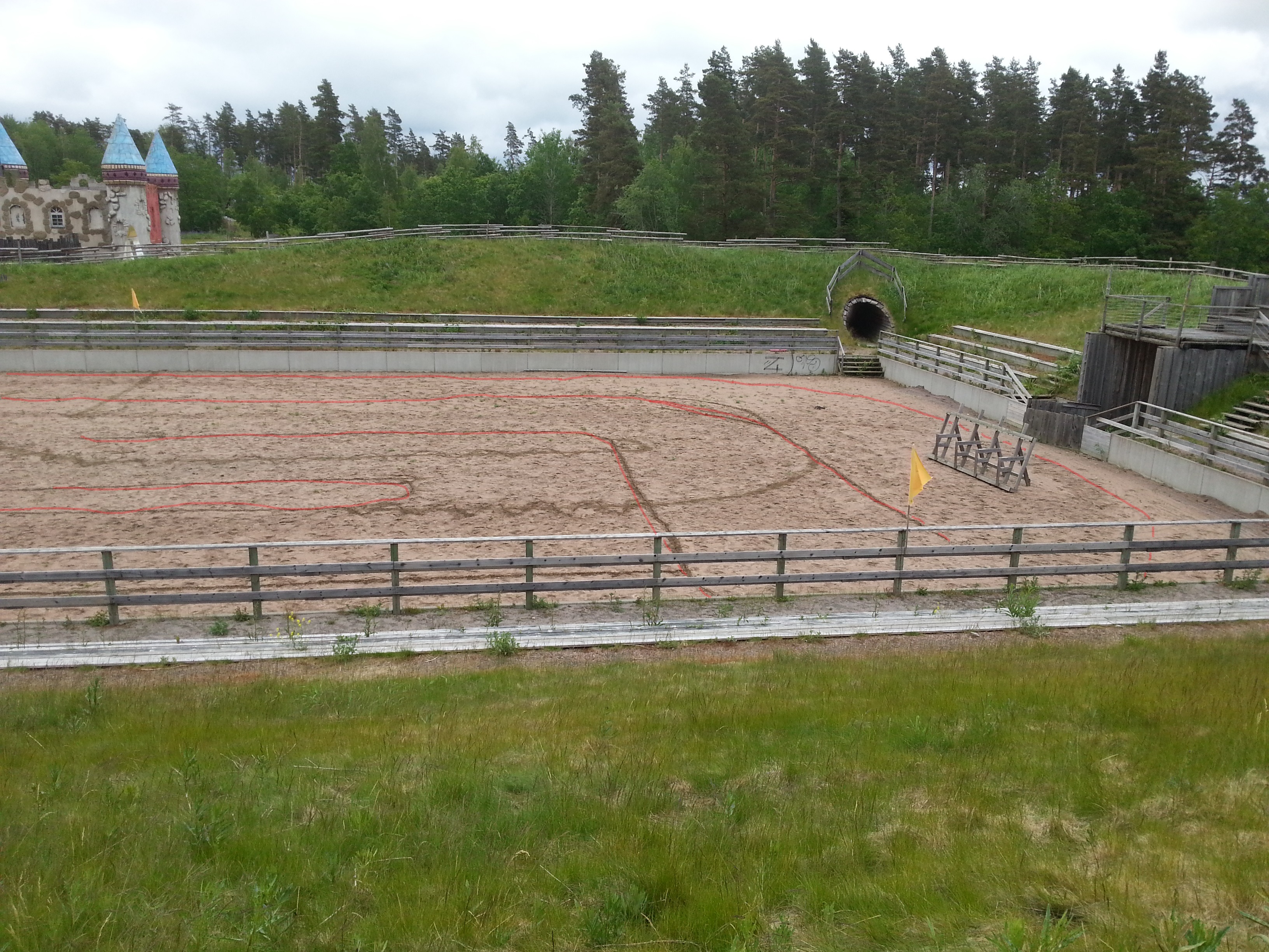 Banan är förlagd på en arena byggd för tornerspel med läktare på båda sidor.