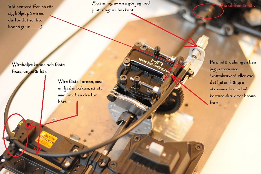 Som ni ser på första bilden så har jag fixerat innerdelen på bromswiren vid centerdiffen (med en justering så att jag kan spänna wiren när det behövs. Då är det höljet som rör sig, fram o bak bromsen (om man kan kalla det så) kan justeras med vad jag kallar "vantskruven" kortare skruv=mer broms fram, längre skruv= mer broms bak.
