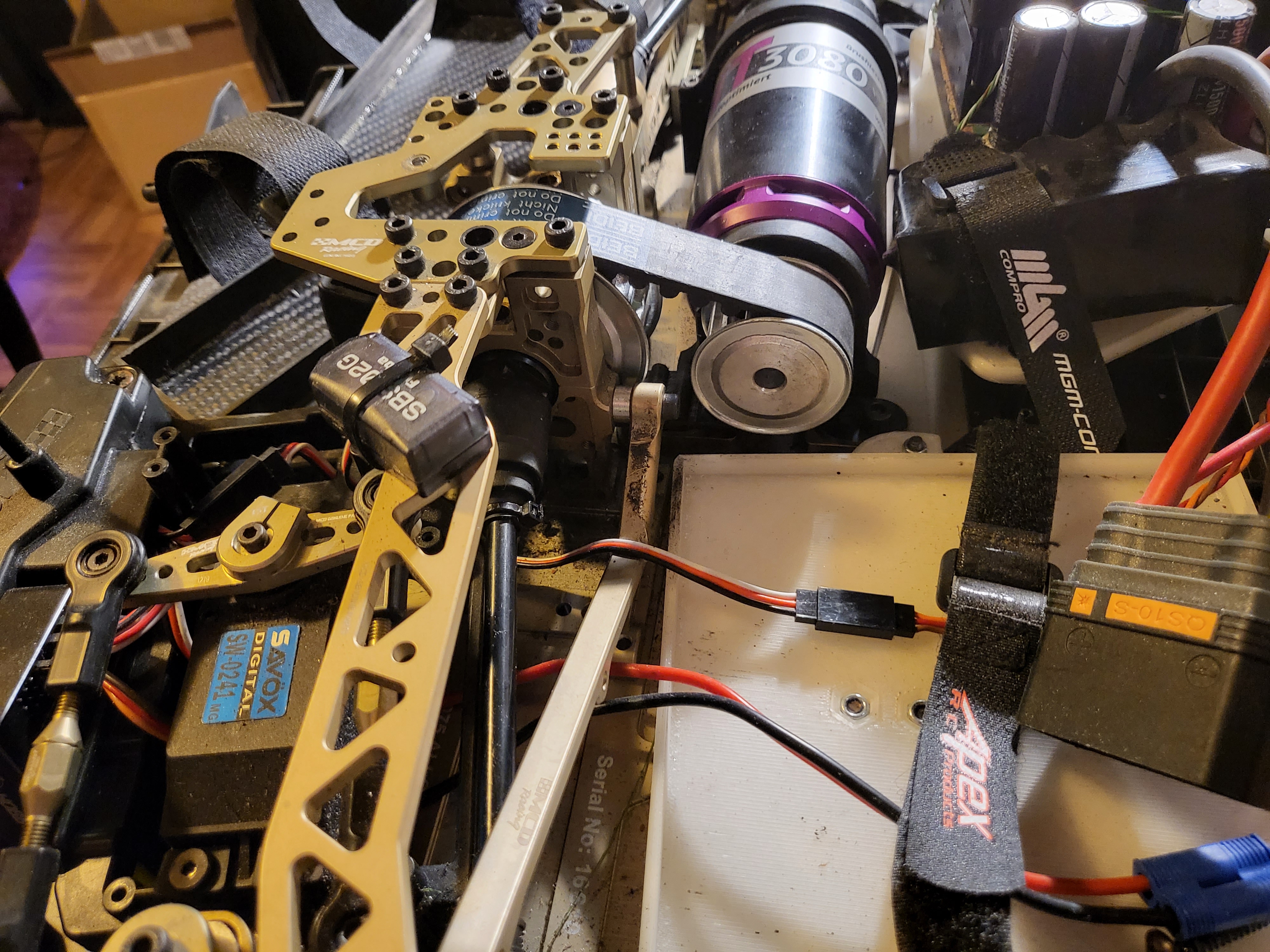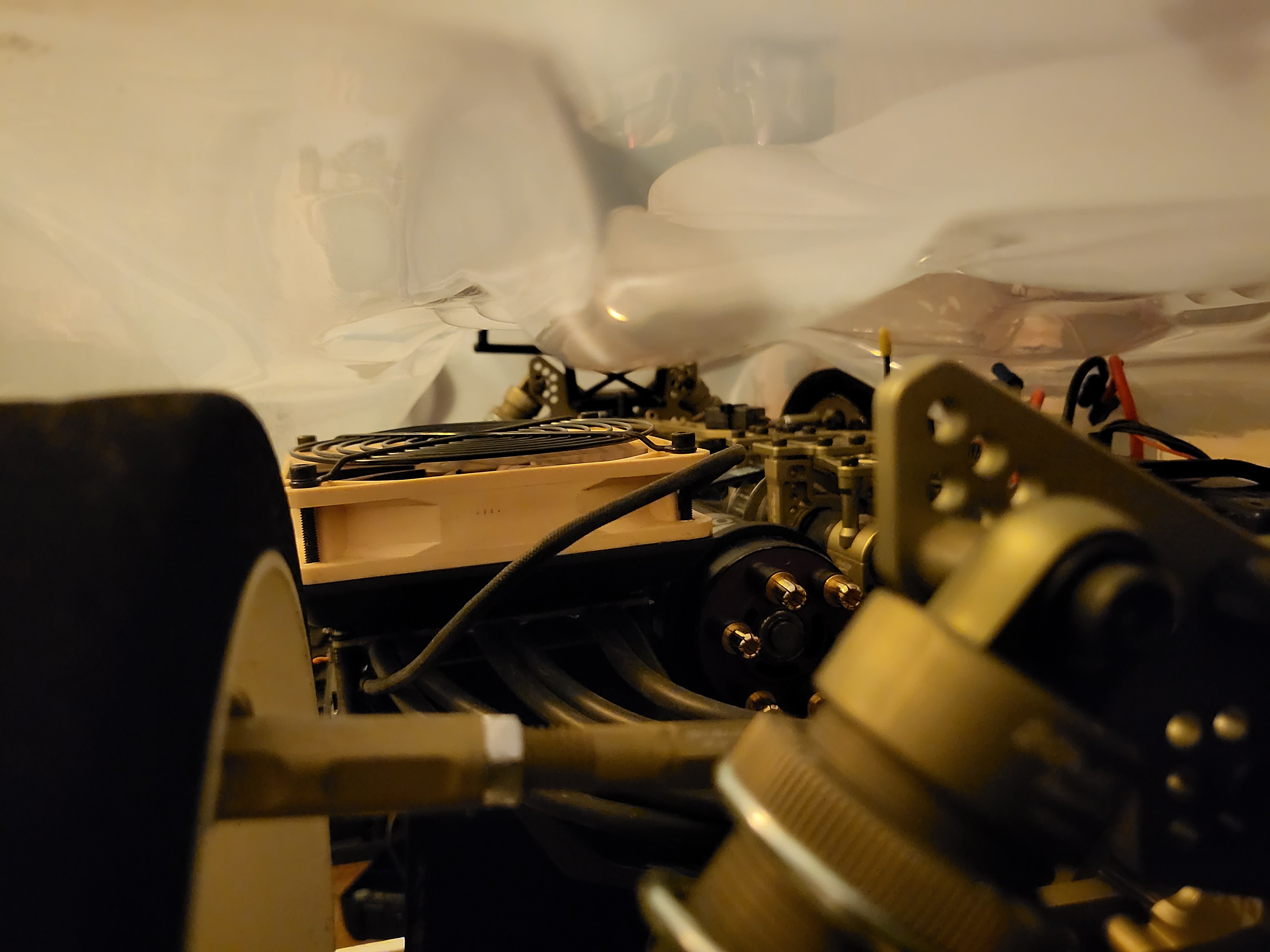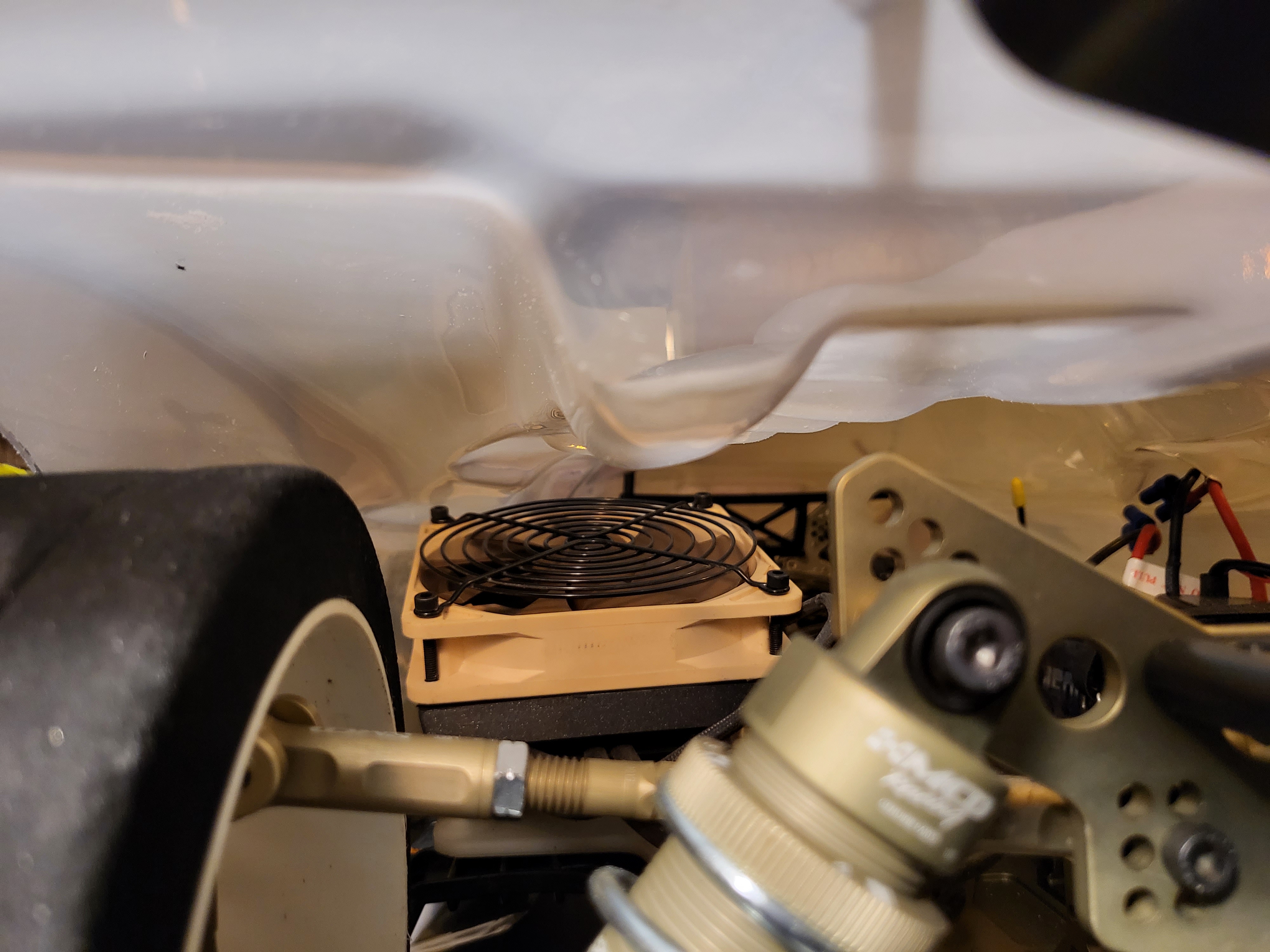 Gillade inte hur nära karossen jag var så gjorde om lite. Kapade 5mm på höjden på esc-hållaren, putsade ytterliggare 5mm på chassisidan och lade fläkten platt på esc. Eftersom jag printade nytt så passade jag på att använda lite snyggare filament med 20% cf. Då kolfiber leder ström så fick jag även printa små distanser i tpu för att isolera esc från hållaren.