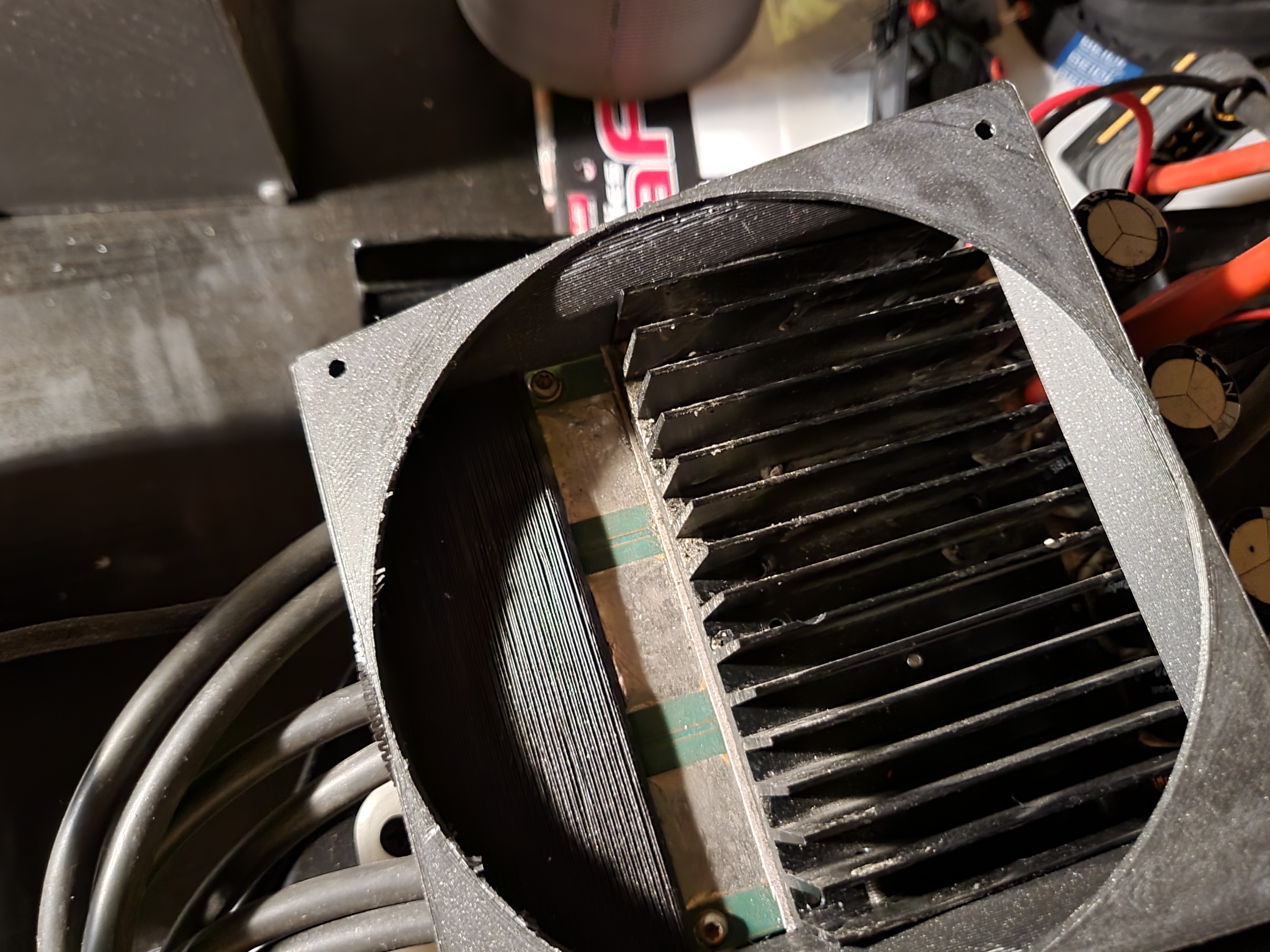 Satte fingret i fläkten på esc och knäckte ett blad. Istället för att köpa ny 50mm fläkt så gjorde jag en adapter för att få på en 120mm istället. Flyttar mer luft och låter mindre.