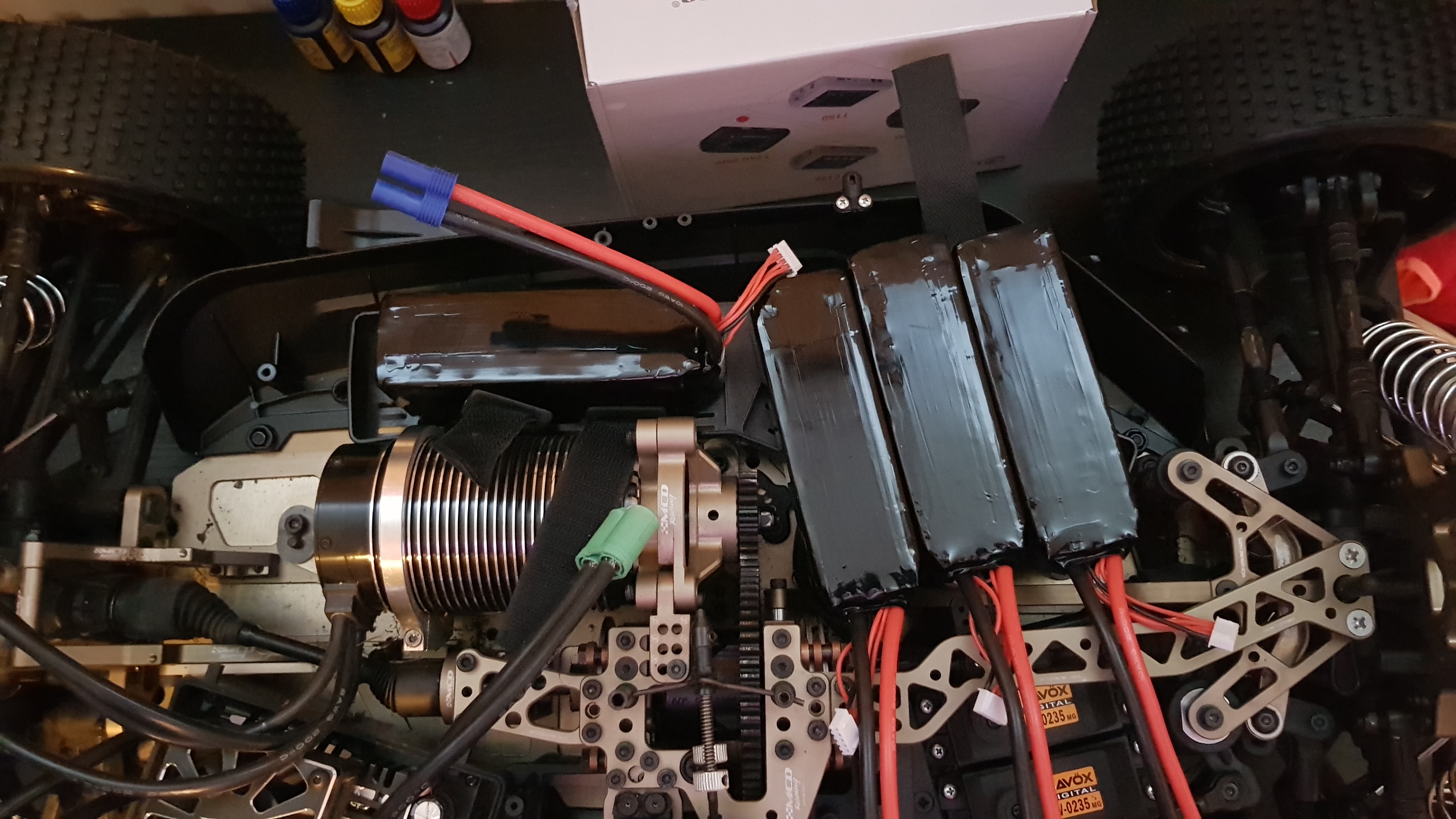 På många sätt vore en optimal lösning att sätta esc nere på chassit där du har tänkt sätta 3 batterier. Detta är ju precis framför spur/piniong. Esc får plats där lätt och det är lättare att fixera esc så det inte rör på sig än batterierna som man ska ta i och ur hela tiden. Tittade på den lösningen men avstod b.la för att jag då inte visste hur mkt kylning esc skulle behöva, vet nu det skulle vara lugnt med det. En annan sak man i så fall måste lösa är att hålla bort alla sladdar ut från esc från dreven. Men batterimässigt blir den stora fördelen att inga batterier hamnar där nära dreven och att man kan använda höger bak hörnet där du och jag nu har våra esc till batterier. Troligen bättre även för vitbalans mellan fram o bakaxel. Alla batterierna långt fram blir en nostung bil.