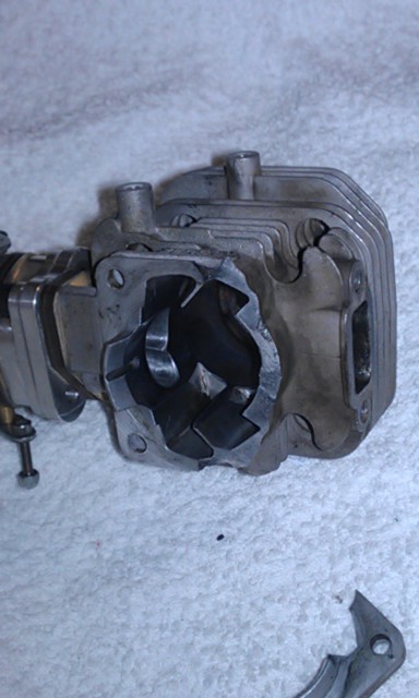 Idag var jag på stubben för att först och främst byta ut skruven som håller förgasaren i insulatorn för att den gick av när vi var i Göteborg i helgen och körde NM'et och tack vare det så fick jag bryta min semifinal efter bara 9 varv (surt). Men inte nog med det så efter ca 10minuters körning idag så rusade motorn på tomgång och när jag senare ikväll rev isär motorn så visade det sig att även den 4-bultade cylindern kan dela på sig. Jävla skit sport!