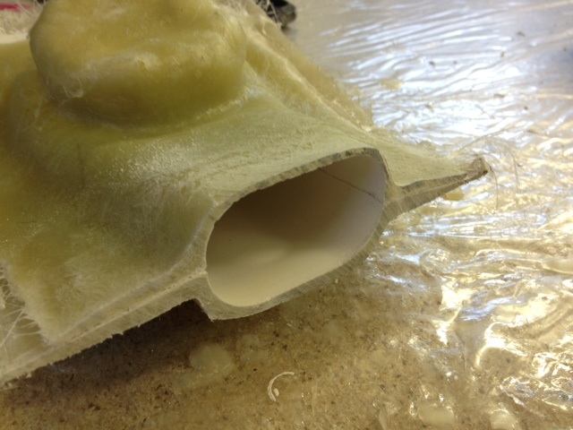 inputs ä alltid bra , fast för en gångs skull ligger jag steget före , pipan tillverkas i ett par delar jag kommer kapa loss ljuddämparburken och även gjuta av baffelkonen , den tillverkas sedan i ett stycke med hjälp av kolfiberstrumpa medan stora kröken tillverkas tvådelad för att sedan limmas ihop med epoxy som är tilltjockad med mikroballonger . Det bästa med prepregfibern är att pipan blir lika stark som stål