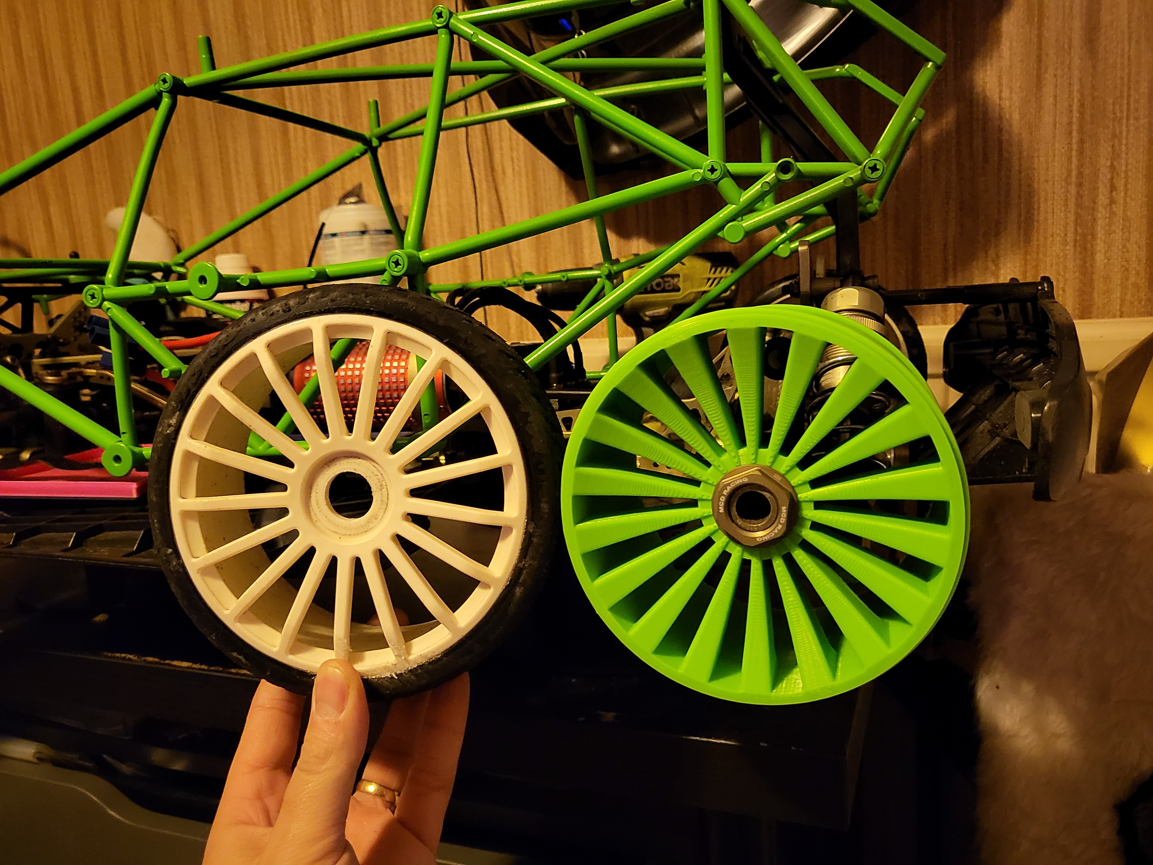 Går drygt 400gr abs per fälg, varav nästan hälften kasseras då det används som support för att hålla upp centrumet. Printar man med utsidan upp så blir det fint men går mycket plast till support, printar man med utsidan nedåt så gpr det mindre plast, typ 100gr mindre, men ytan blir ful, då den läggs mot support, plasten slår sig gärna (abs gör gärna det).