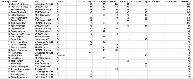 Dock lite osäker hur jag skulle göra med Melvin i Staffanstorp, inga poäng för diskat men han blev TQ, ska han då ha 1 poäng? (Räknas ju ändå inte) eller ska den gå till Fredriksson? (Resultatet kommer ändå inte räknas för det var hans "sämsta" resultat. Så egentligen spelar det ingen roll:)
