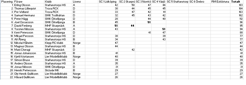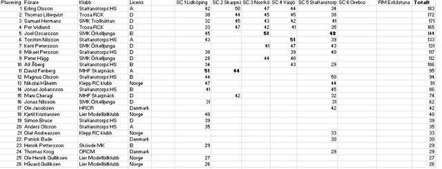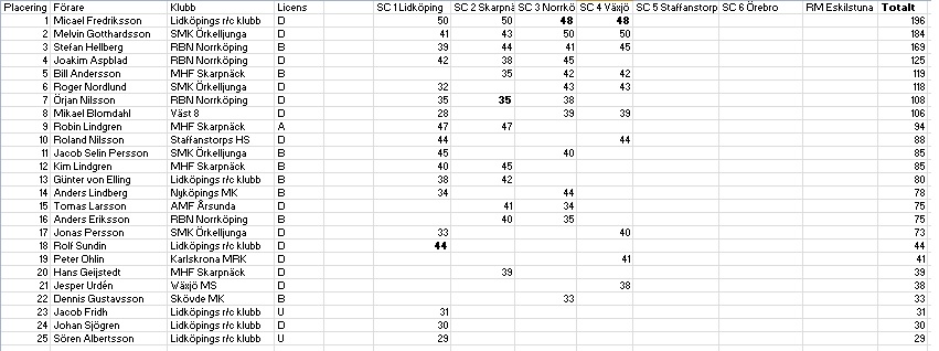 Dock lite osäker hur jag skulle göra med Melvin i Staffanstorp, inga poäng för diskat men han blev TQ, ska han då ha 1 poäng? (Räknas ju ändå inte) eller ska den gå till Fredriksson? (Resultatet kommer ändå inte räknas för det var hans "sämsta" resultat. Så egentligen spelar det ingen roll:)