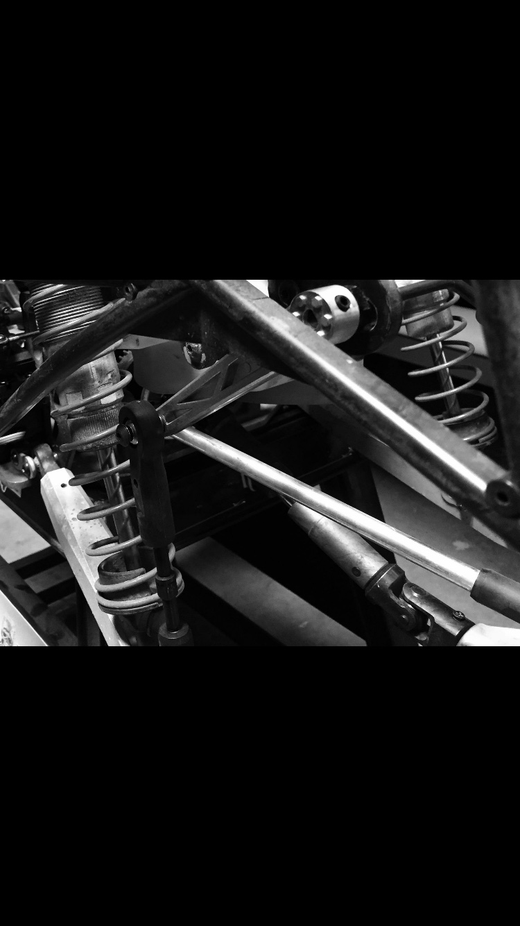 Massive shock bodies are hard ANO with 8mm shaft. Upper links are aluminum. Our philosophy is that we want this Beast to bridge the gap between RC/Motorsport.
