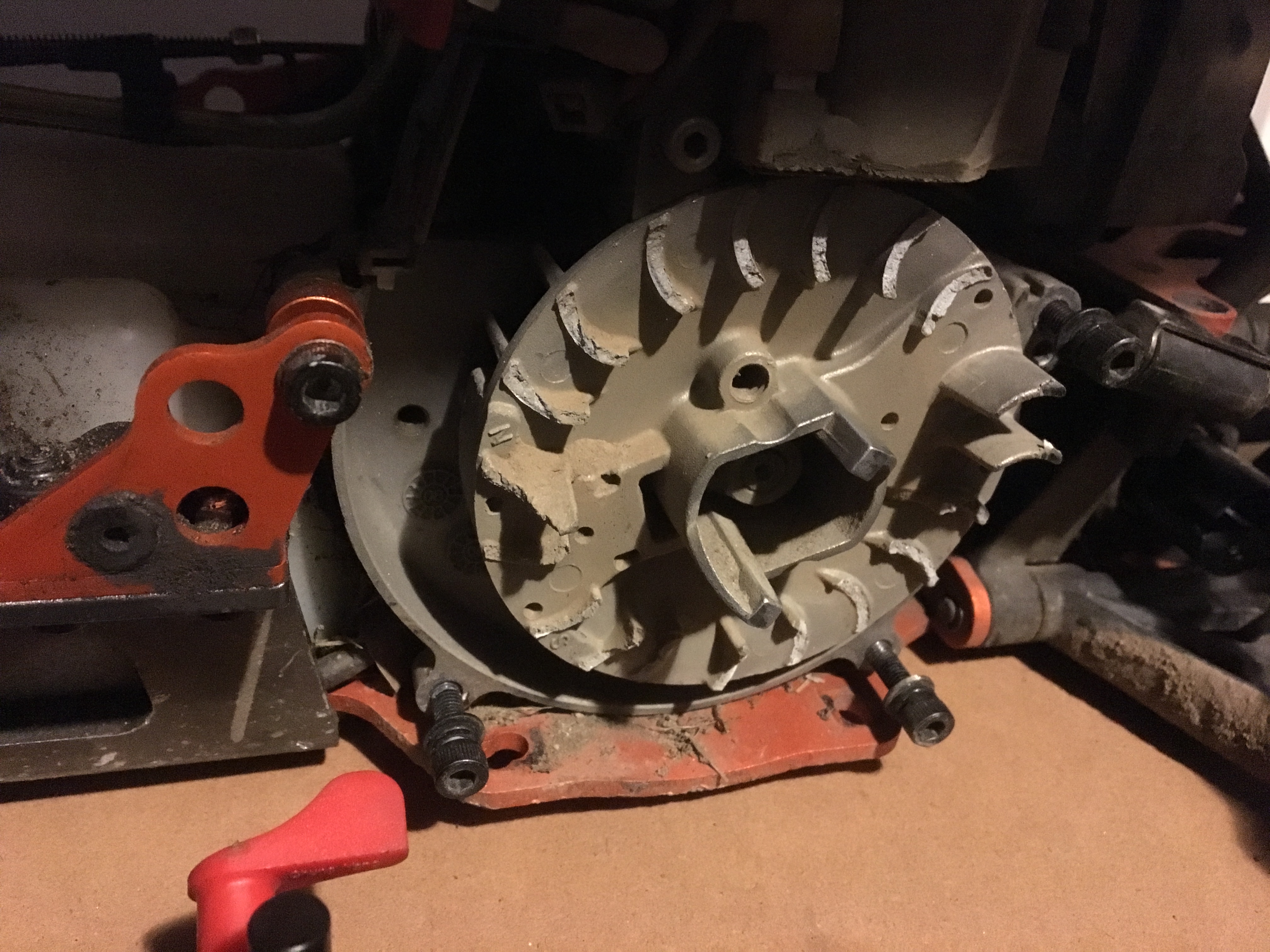 Nu står det lite still när man inte har verktygen man behöver... ffa till bensinmotorerna då. Min sista körning var visst lite mer våldsam än jag först trott... passar även på att byta ut klock/pinion hållaren till en från ddm (ingen aning om vad det är för märke men ser bra ut)