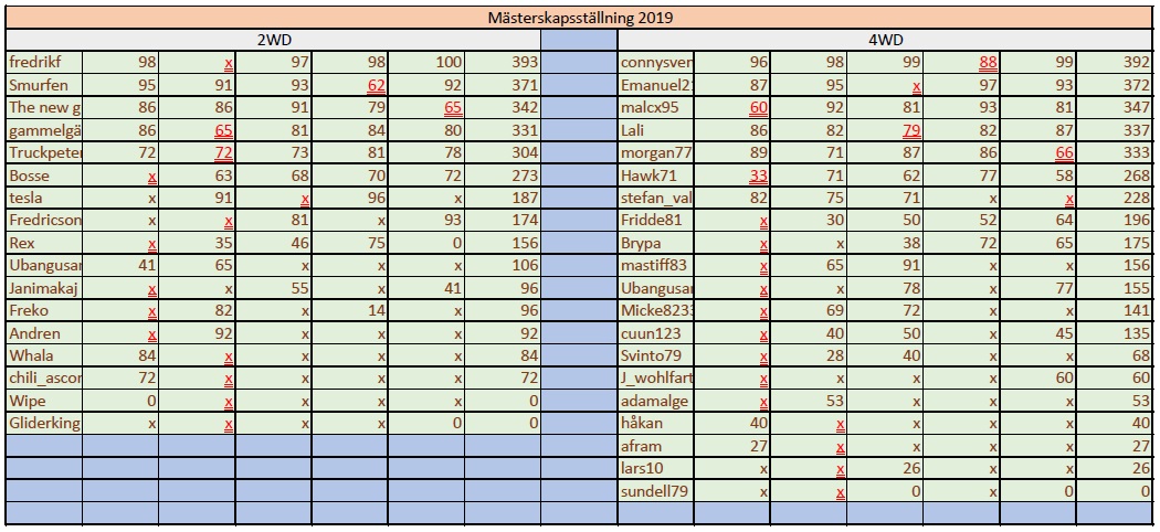 Får nämligen fel på 2WD när jag uppdaterar och lägger deltävlingarna bredvid varann. Har jag bara totalen fungerar det.