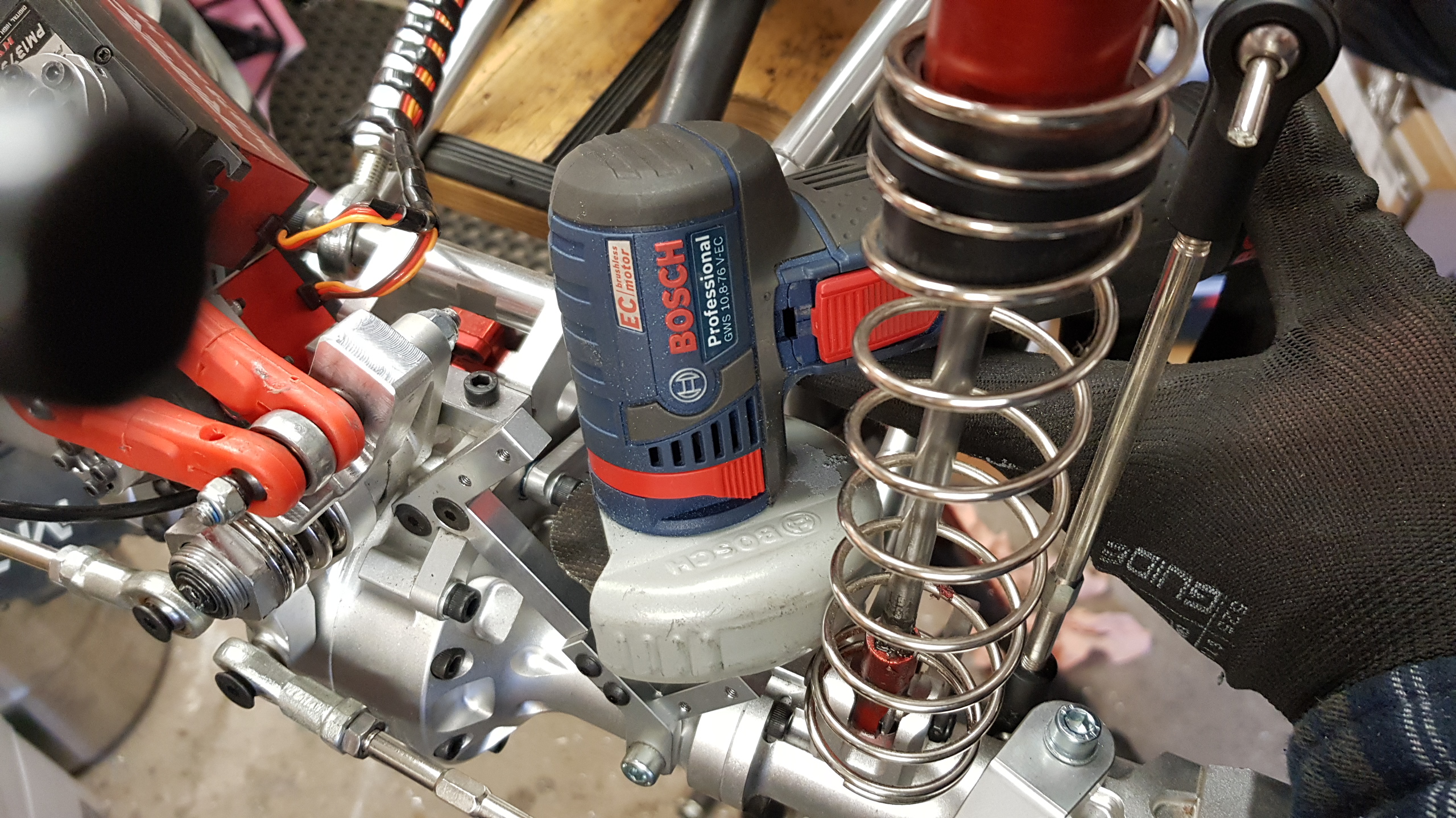 Skönt när man får in vinkelslipen mellan stötdämparen och växelhuset.