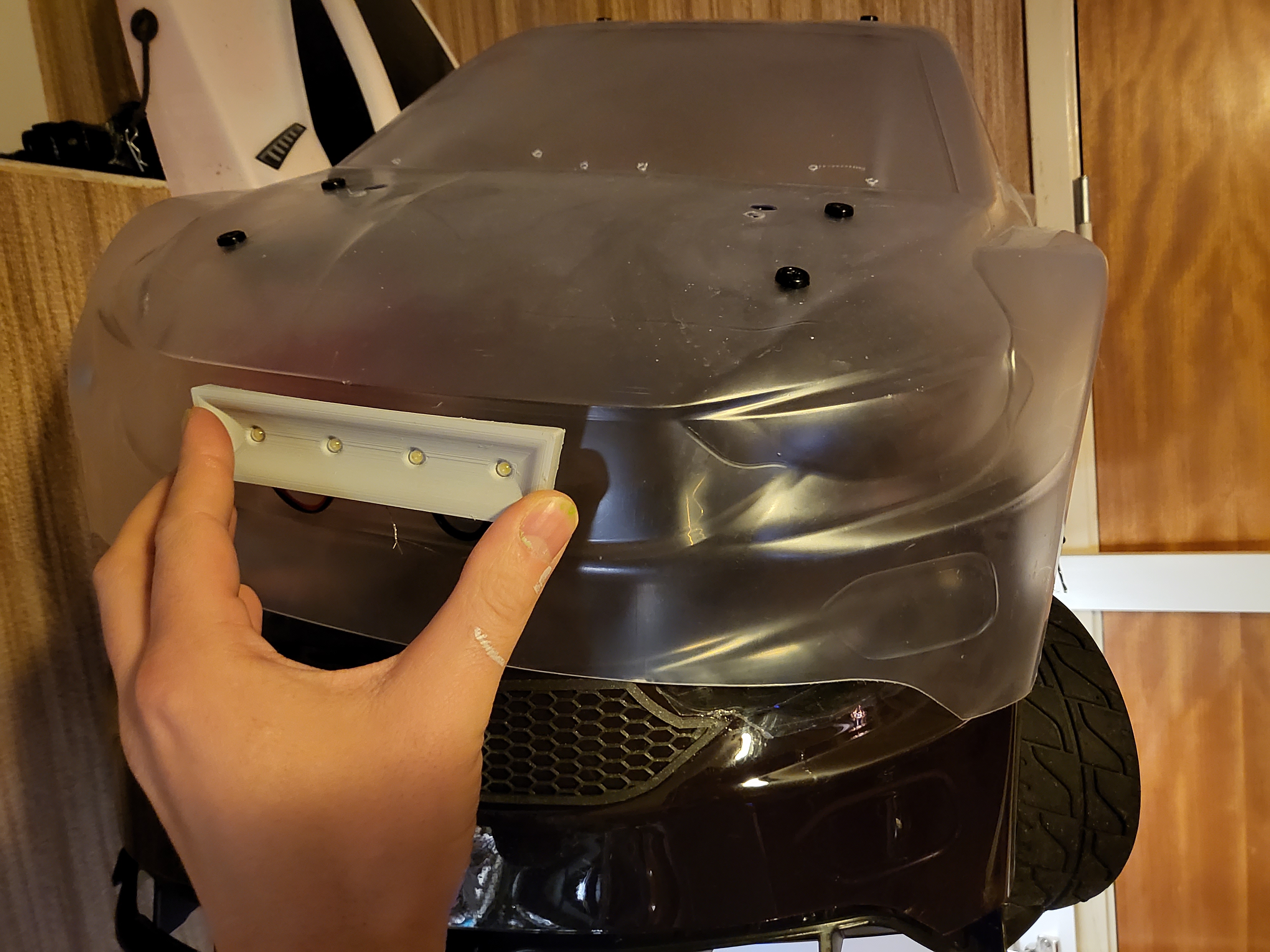 Blev lite dåligt med kräm i den gröna dioden i trianglen bara. Så blir det orange i den andra trianglen sen. Men börjar närma mig det läget att jag behöver få färg på karossen för att komma vidare, kan inte lödda på en massa långa kablar förrän de är på plats och man får rätt längder. Har en ny version av extraljus till denna med.