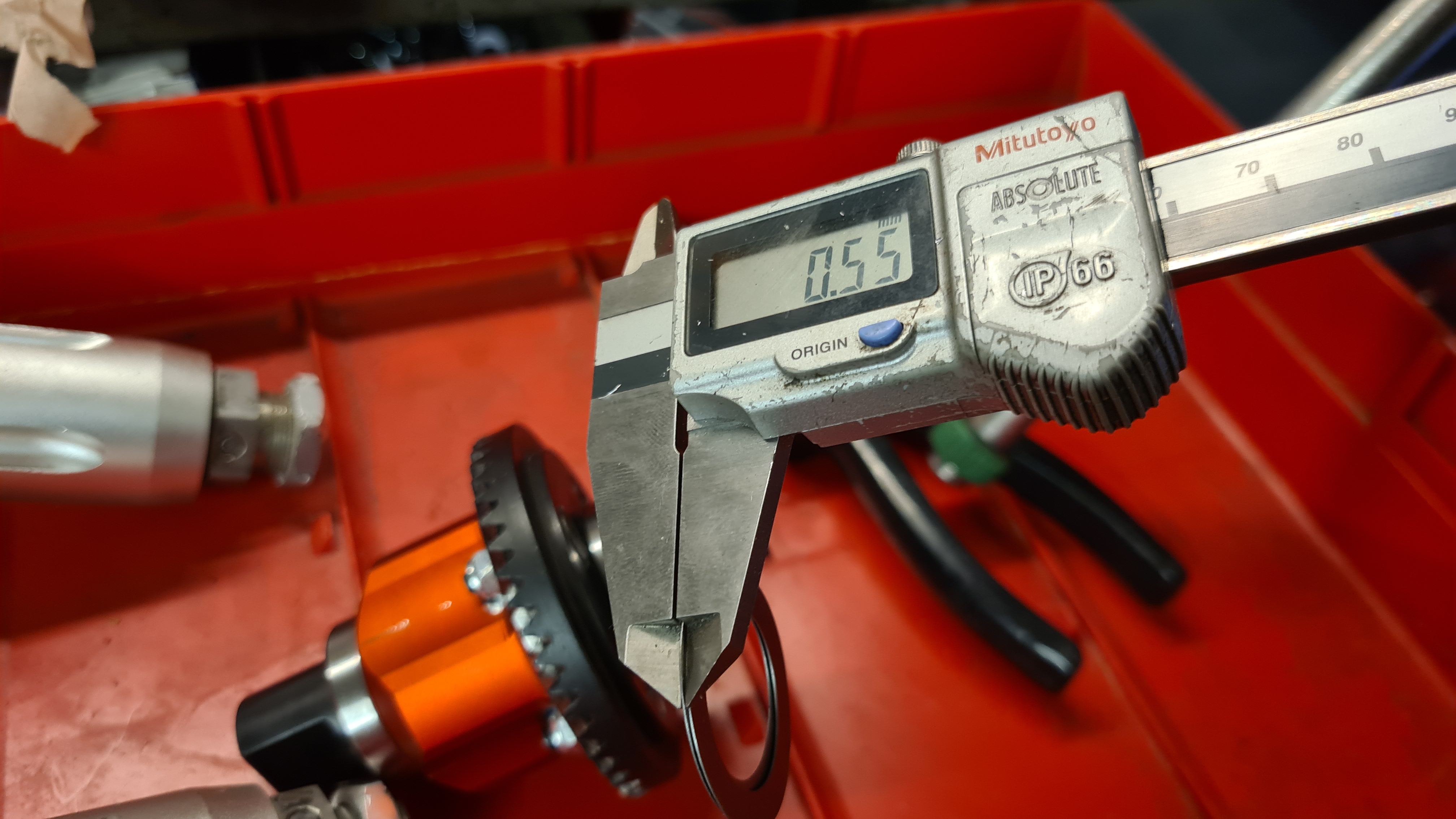 Shimsade diffen 0.55mm i sidled för att flytta den så nära piniongen som möjligt, och kunde även shimsa in piniongen 0.30mm för att få den precis på gränsen.