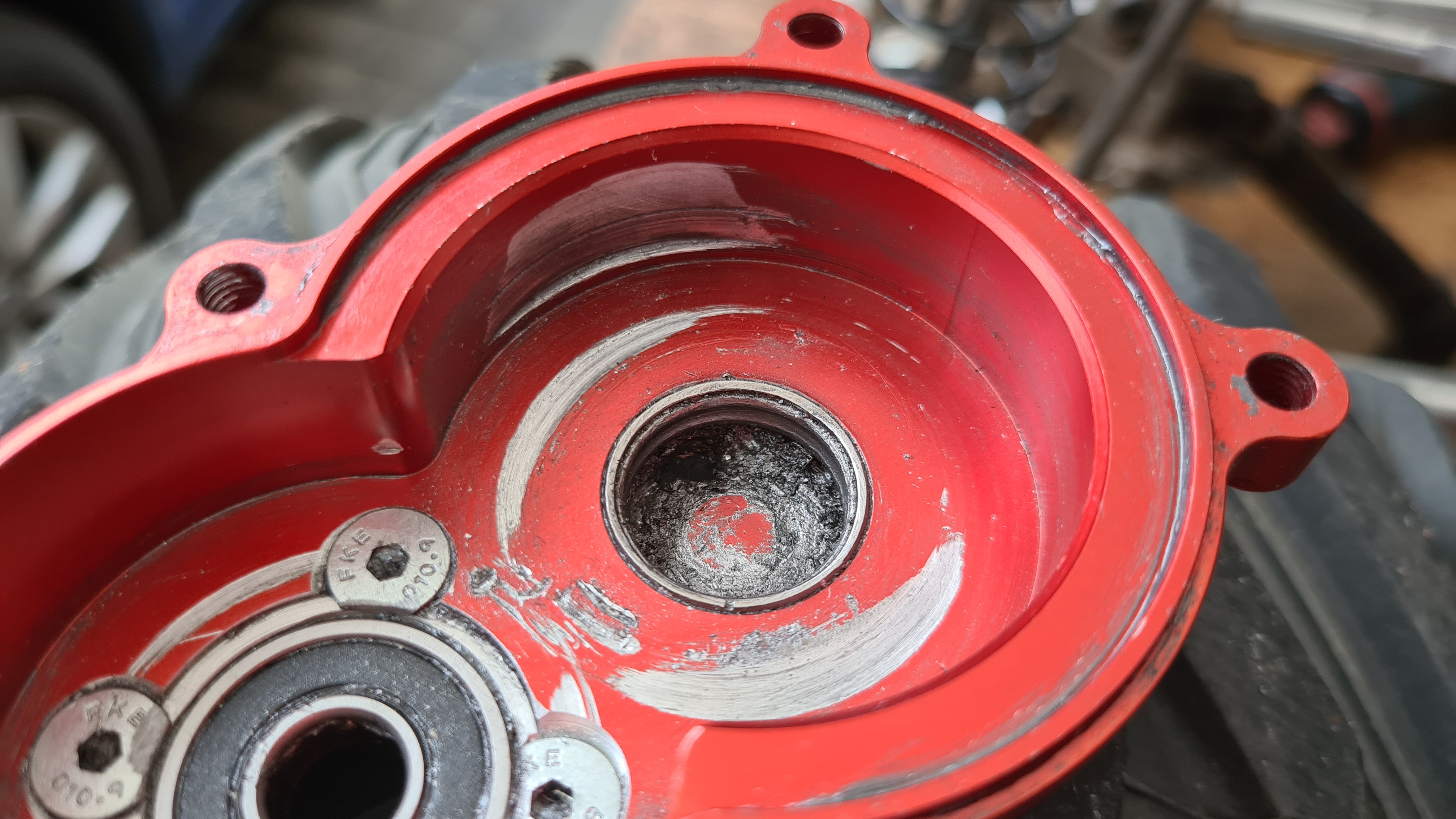 Det hade fått tag på delar av kullagret som satt inpressade flera mm i godset.