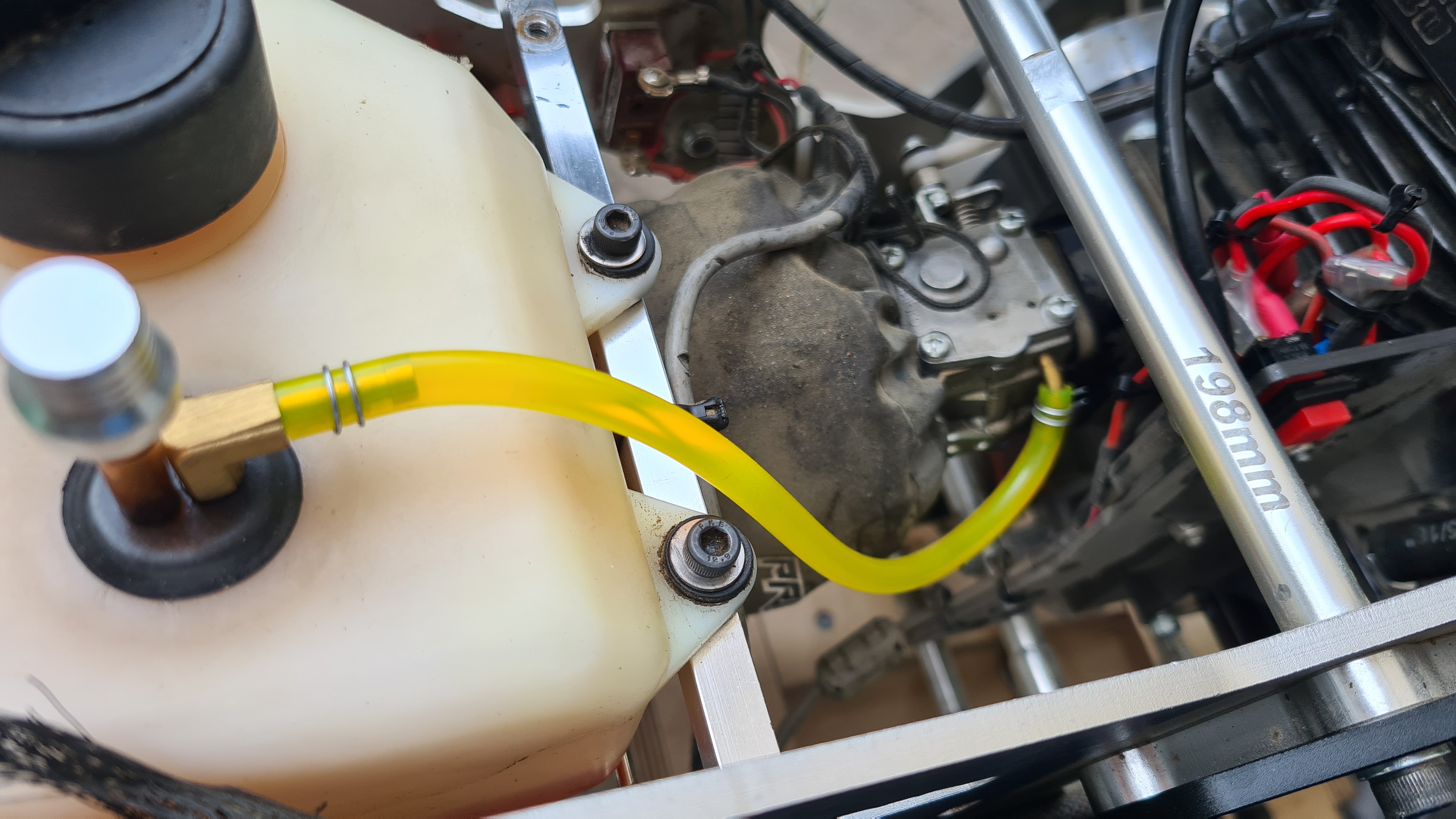 Idag var det dags att fixa lite bättre bränsleslang, och en bättre klunk i tanken, och även fixa lite trådar till killswitchen som hade vibrerat loss!
