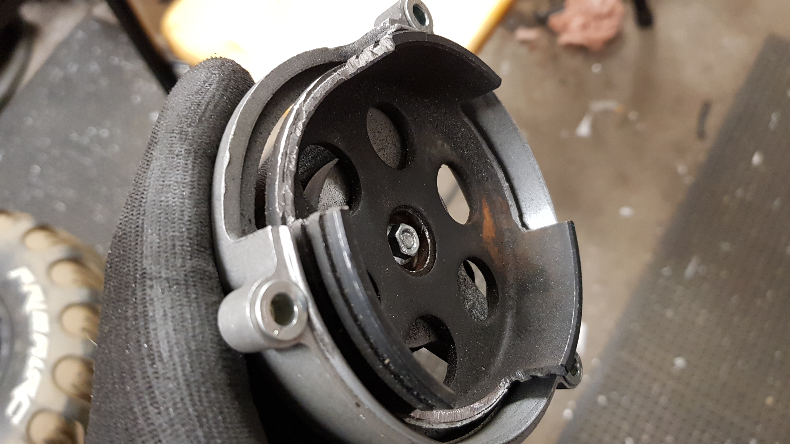 Kapade ur kopplingsklockan med vinkelslip för att ge dragstartens greppklo något att fånga.