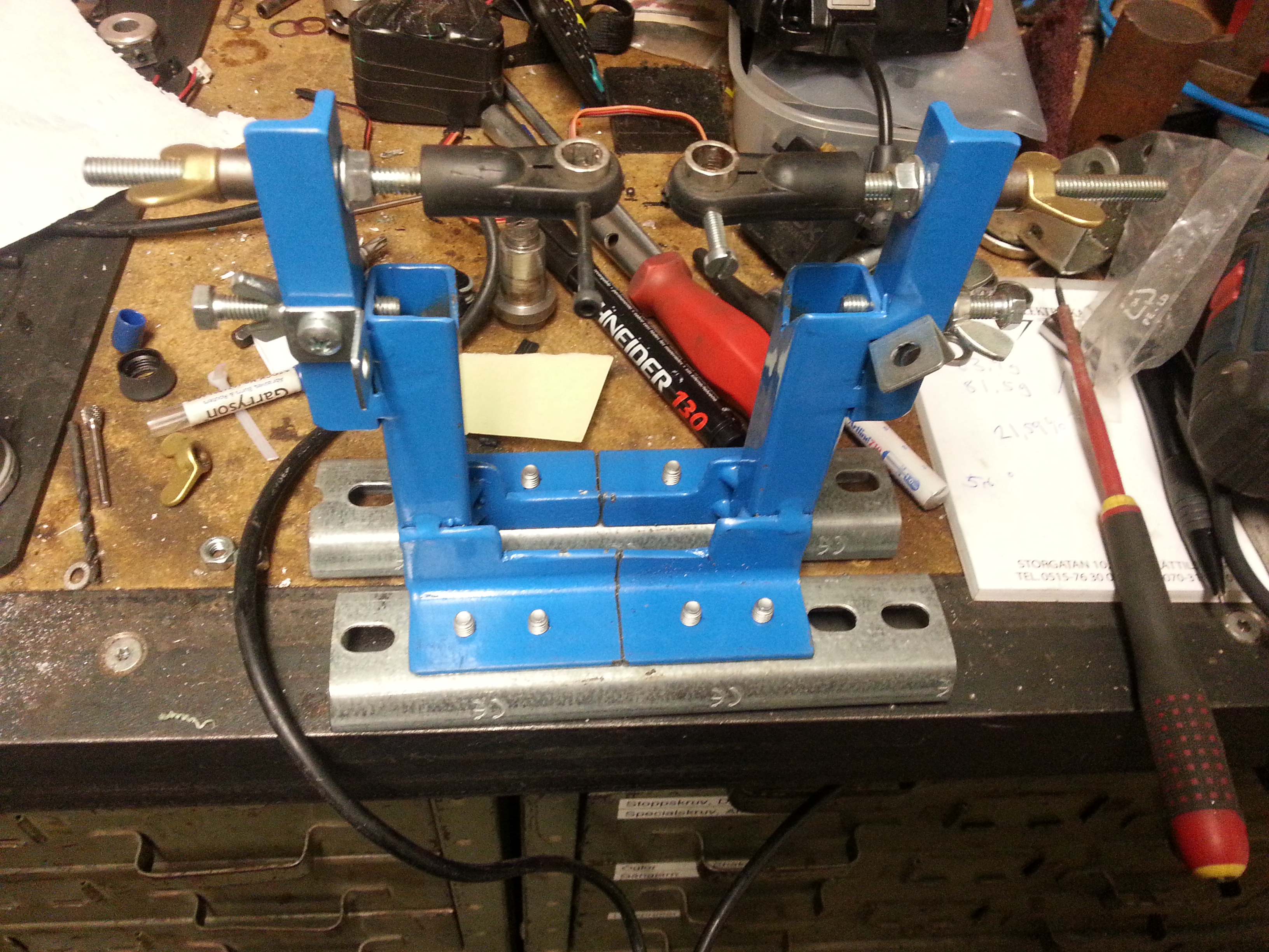 Och med en längre vev kan man ju inte mäta skevhet i den vanliga jiggen jag har.....så jag kapade isär den och monterade halvorna på ett par bitar pendelskena.
