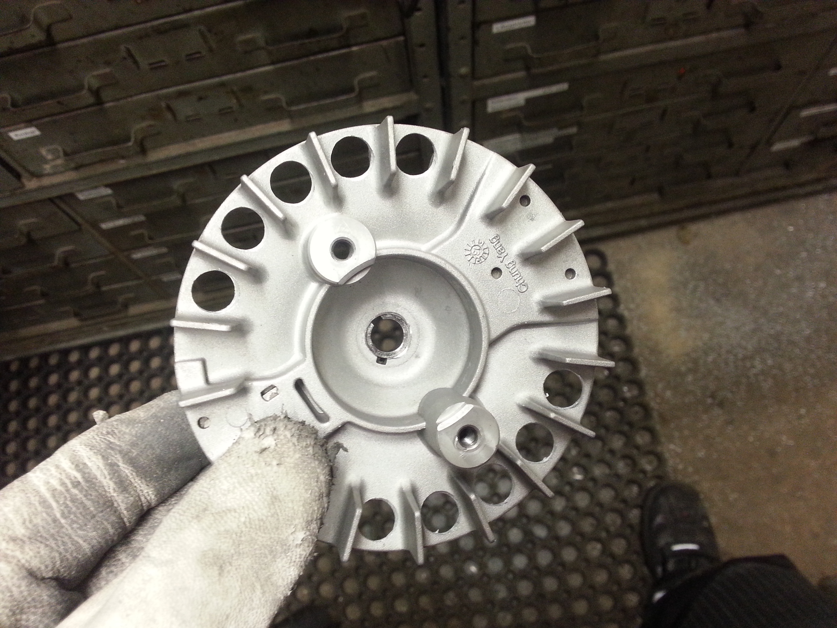 Lättade svänghjulet genom att borra ett antal 10mm hål och svarva av det 8-10mm på bredden.
