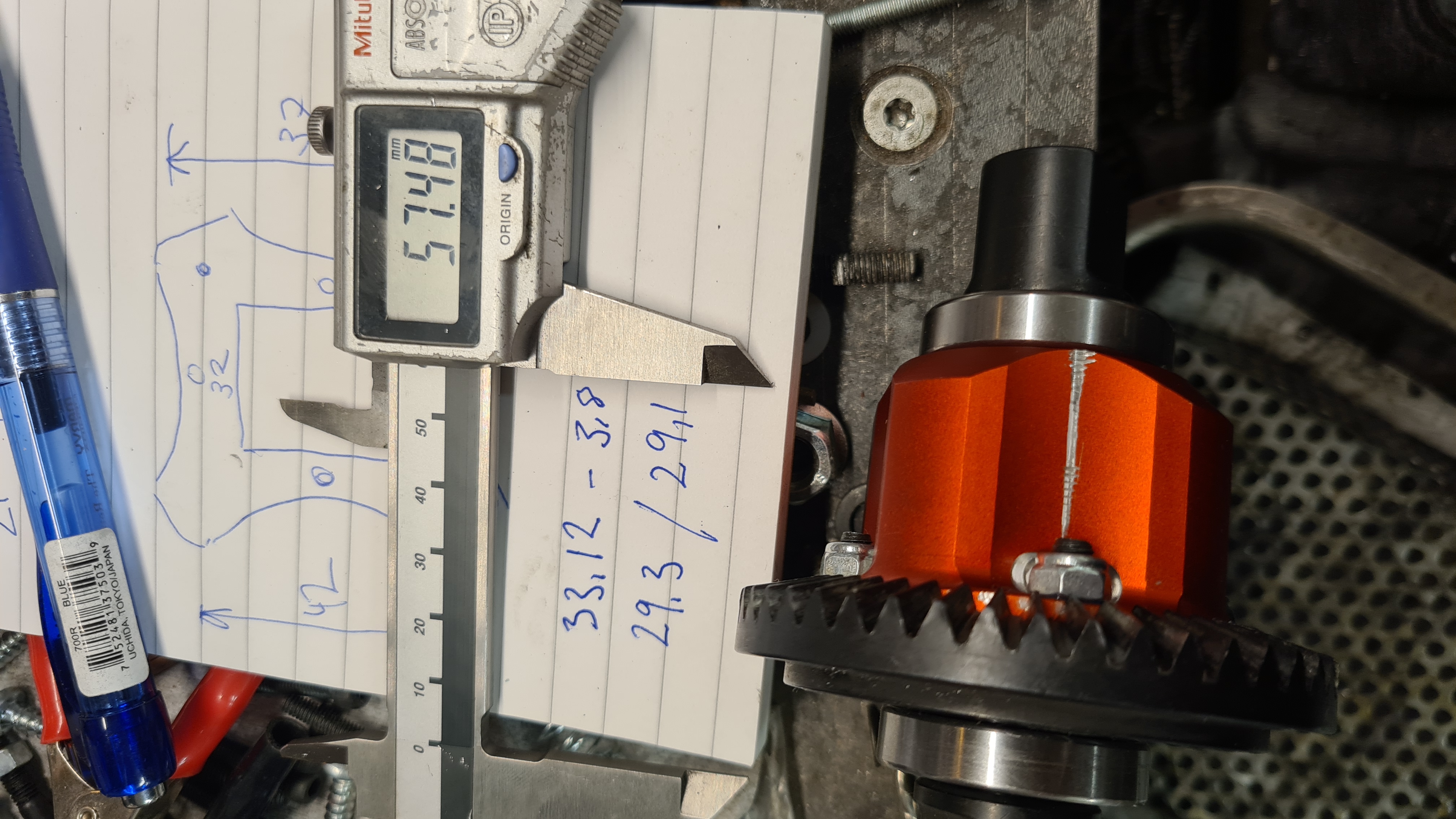 Shimsade diffen 0.55mm i sidled för att flytta den så nära piniongen som möjligt, och kunde även shimsa in piniongen 0.30mm för att få den precis på gränsen.