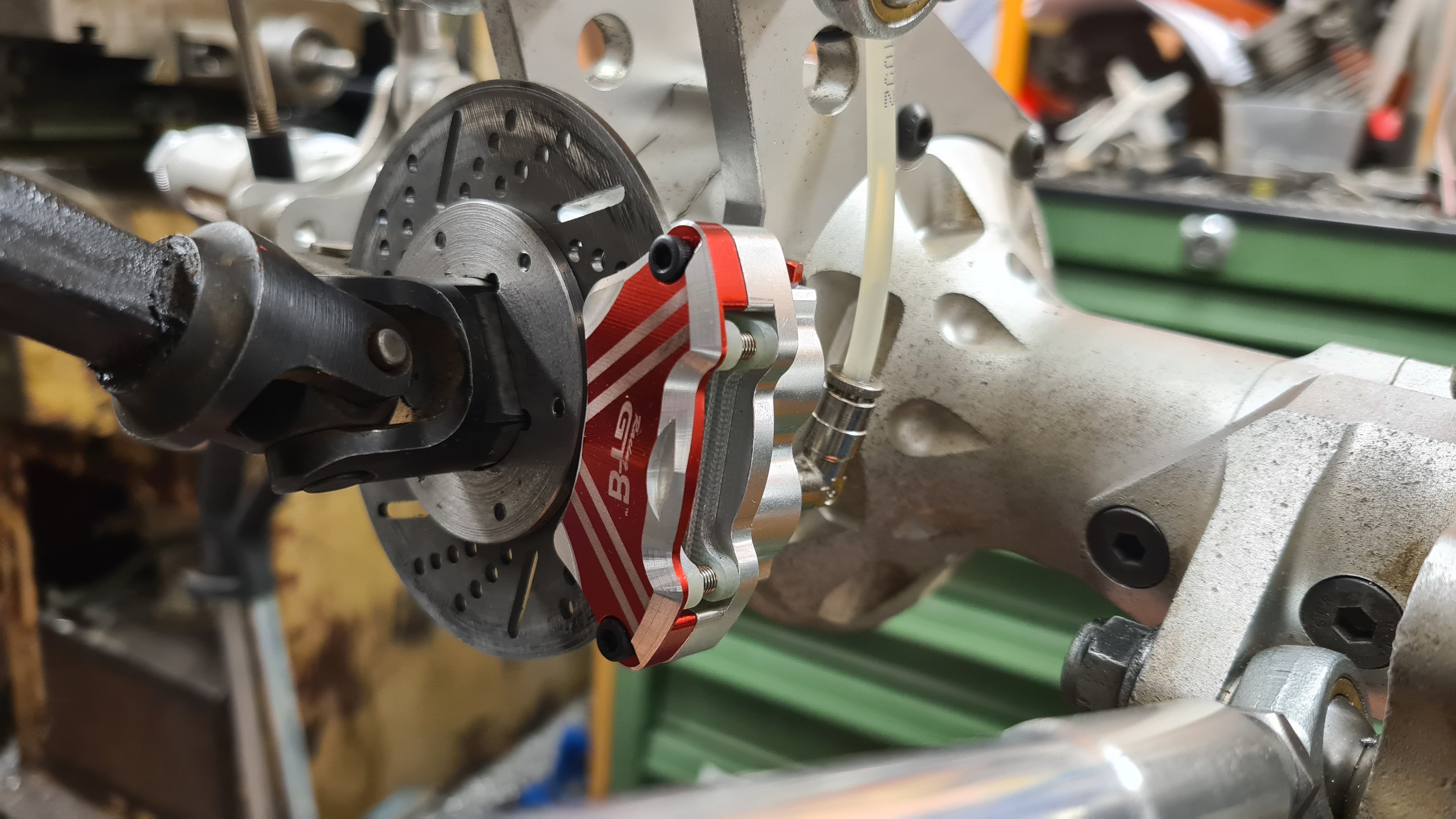 Lite bökigt att ansluta bromsvätskepåfyllningen till huvudbromscylindern utan att få luft i det, så jag monterade en simpel strypventil med en kort slangbit som bara sitter i en dummy-koppling på chassit.