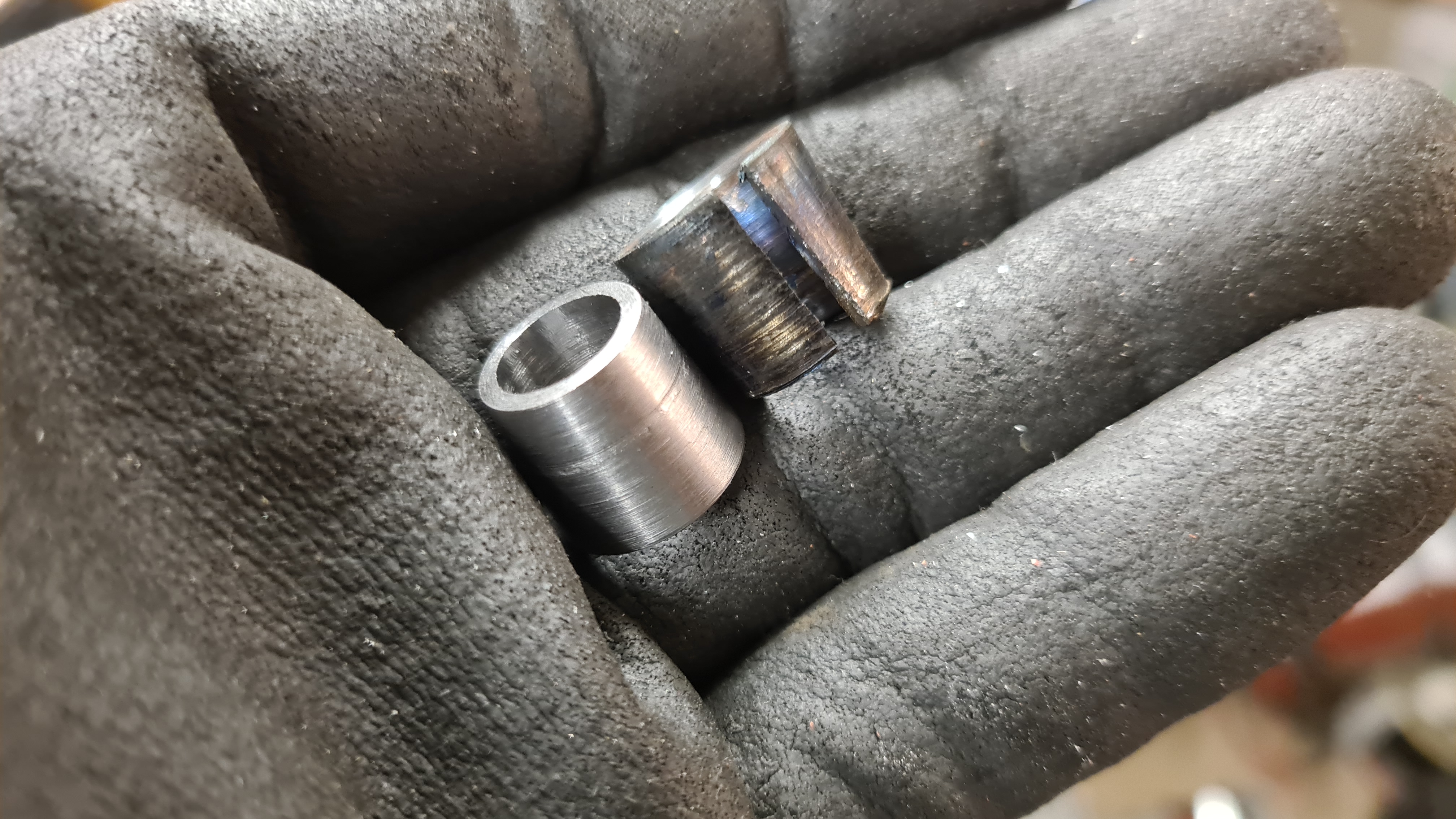 Hålet i kopplingscentrumet är uppslipat till ca 10,5mm, och jag svarvade av en mutter så den fick en hals som gick ner igenom hålet.