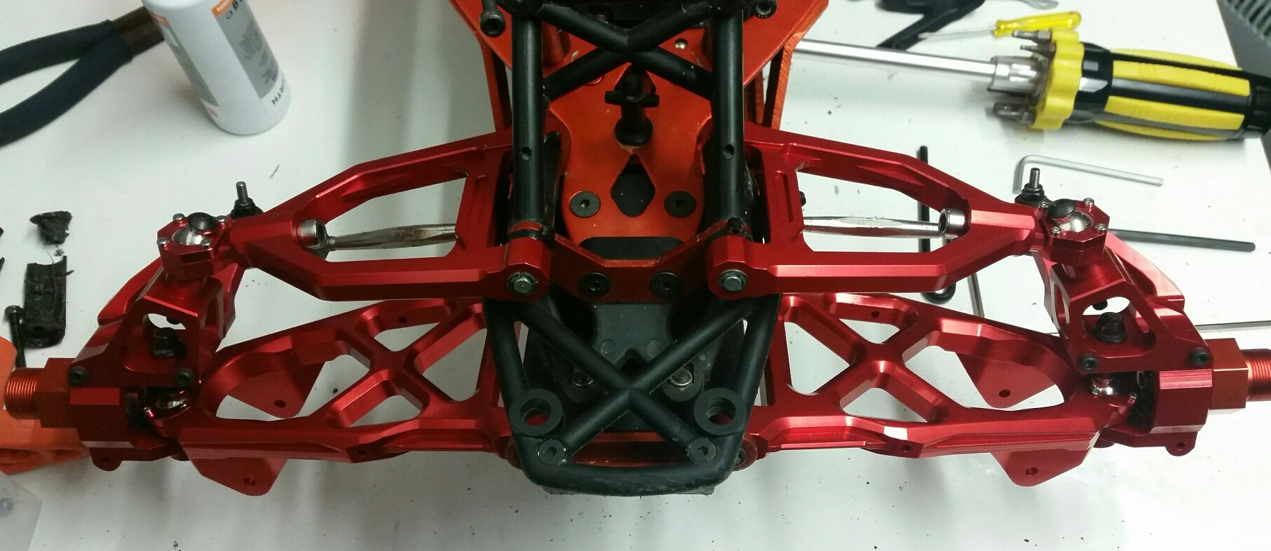 Tack gillar skarpt färgen saknar bara dämparna så är framvagnen klar hade gärna velat få tag på front mount support i alu också sen så är det dags att börja med bakvagnen så man får bort rovan från skötbordet och kan börja med losin