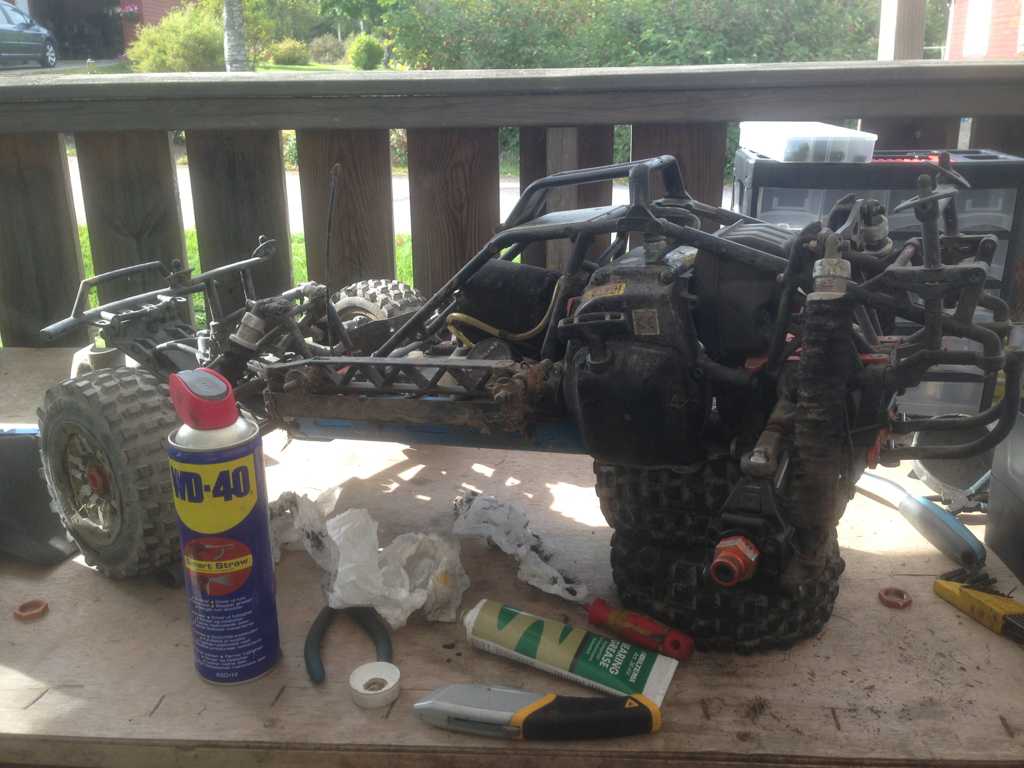 Japp då var skadorna efter gårdagens körning eftersedda. Bara karossen kvar. Får se om jag kan laga den eller om den får bytas ut. Den börjar bli riktigt dålig bak vid infästningarna. Kanske har något att göra med att jag tillbringar mycket tid på sidan eller taket