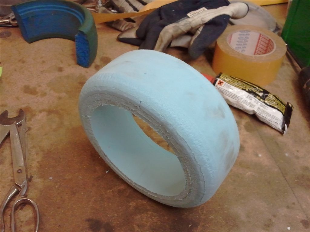 Jag klippte remsor av liggunderlaget som klistrades med dubbelhäftande tejp runt runt i 4 lager och då såg det ut såhär när jag riggat fälgen med foamet i svarven......