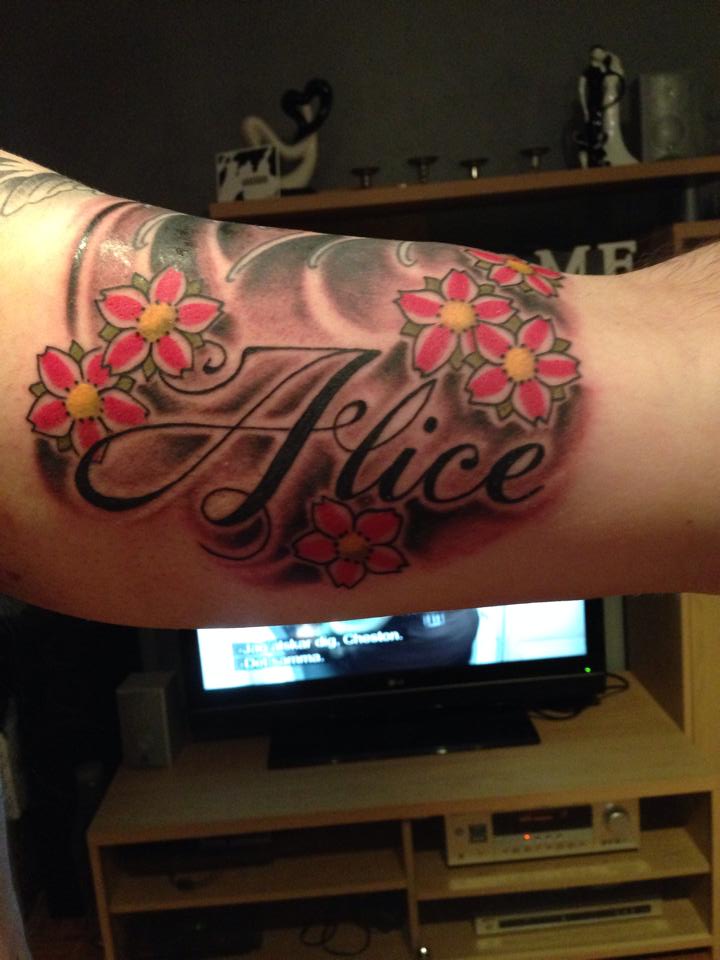 Fick bygga på min ena arm med dotterns namn på insidan.