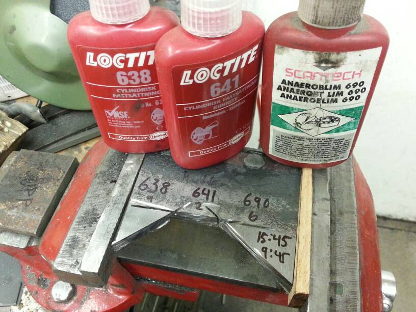 För att bestämma vilket lagerlim jag skulle använda till monteringen riggade jag tre bultar med avsvarvad skalle och en slipad stålyta.