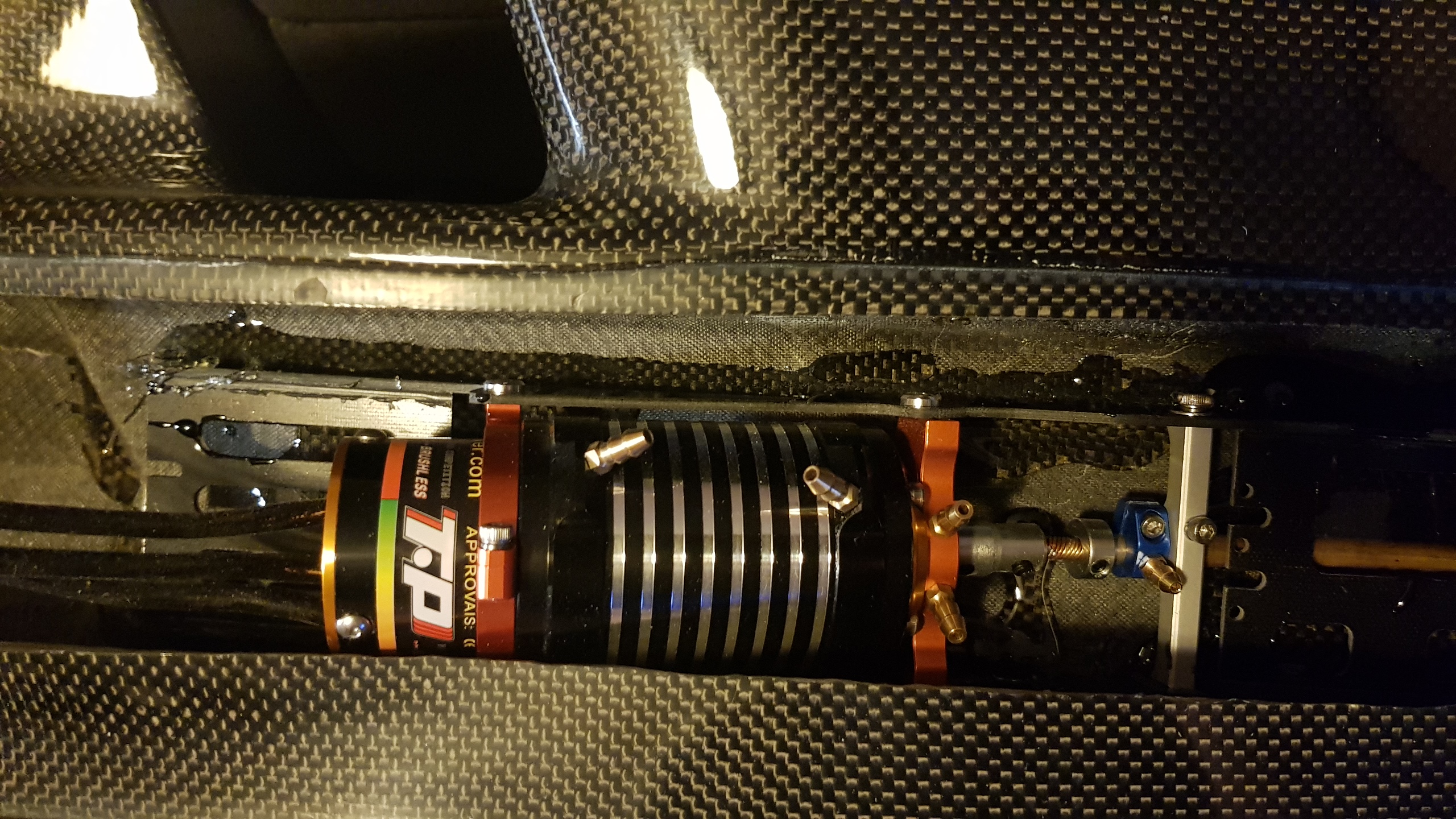 Hade köpt på mig en massa axlar, roder/stinger kombo osv i storlek 1/4" för en vass 40mm motor. Det blev för mycket så la undan den ett tag men har nu skaffat mer lämpliga saker för 3/16" axel, dock fortfarande för 40mm motor. Tanken är att få köra den med en tp 4070 1090kv motor på ett seaking 180a esc. Esc ska klara 8s, dock ändrar 2st 4s cg väldigt mycket så tänkte nöja mig med 4 och 6s i början åtminstånde.