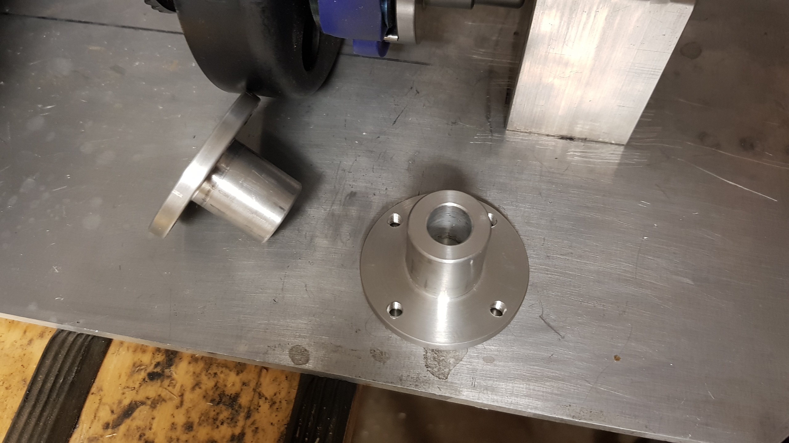 Svetsade fast den ena halva axelkopplingen på klockan, och med presspassning på den andra halvan pressades stödhylsan fast.