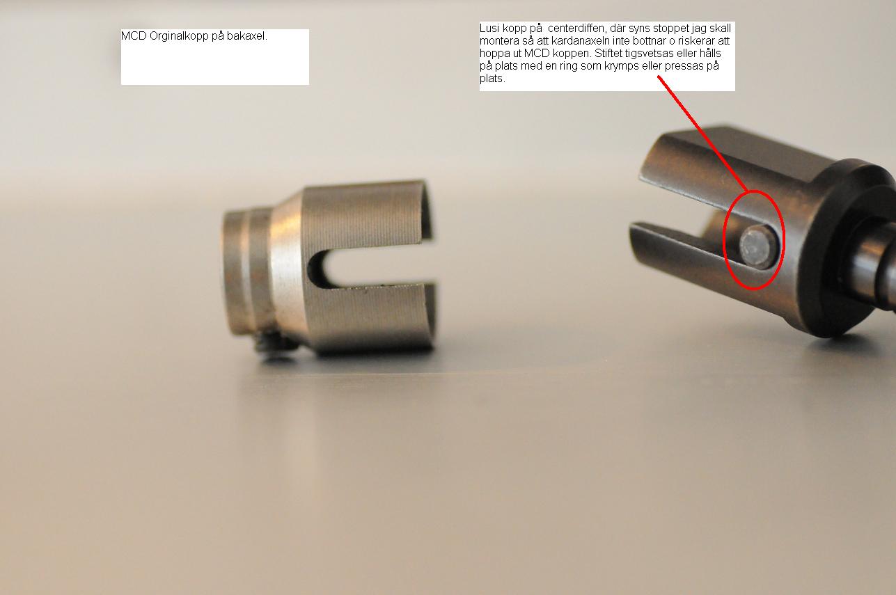 Det ska nog räcka med en bit gummislang inne i koppen som stopp där. Ett mjukt stopp är bättre ifall drivaxeln bottnar vid någon krash när chassit flexar och böjer sig.Lasse Karlsson wrote:Så här tänkte jag lösa problemet med att kardanaxlarna bottnar i Lusins drivkoppar. Ett 5mm stift som antingen tigsvetsas dit eller om man tillverkar en hylsa som krymps/pressas på plats o håller fast stiftet.