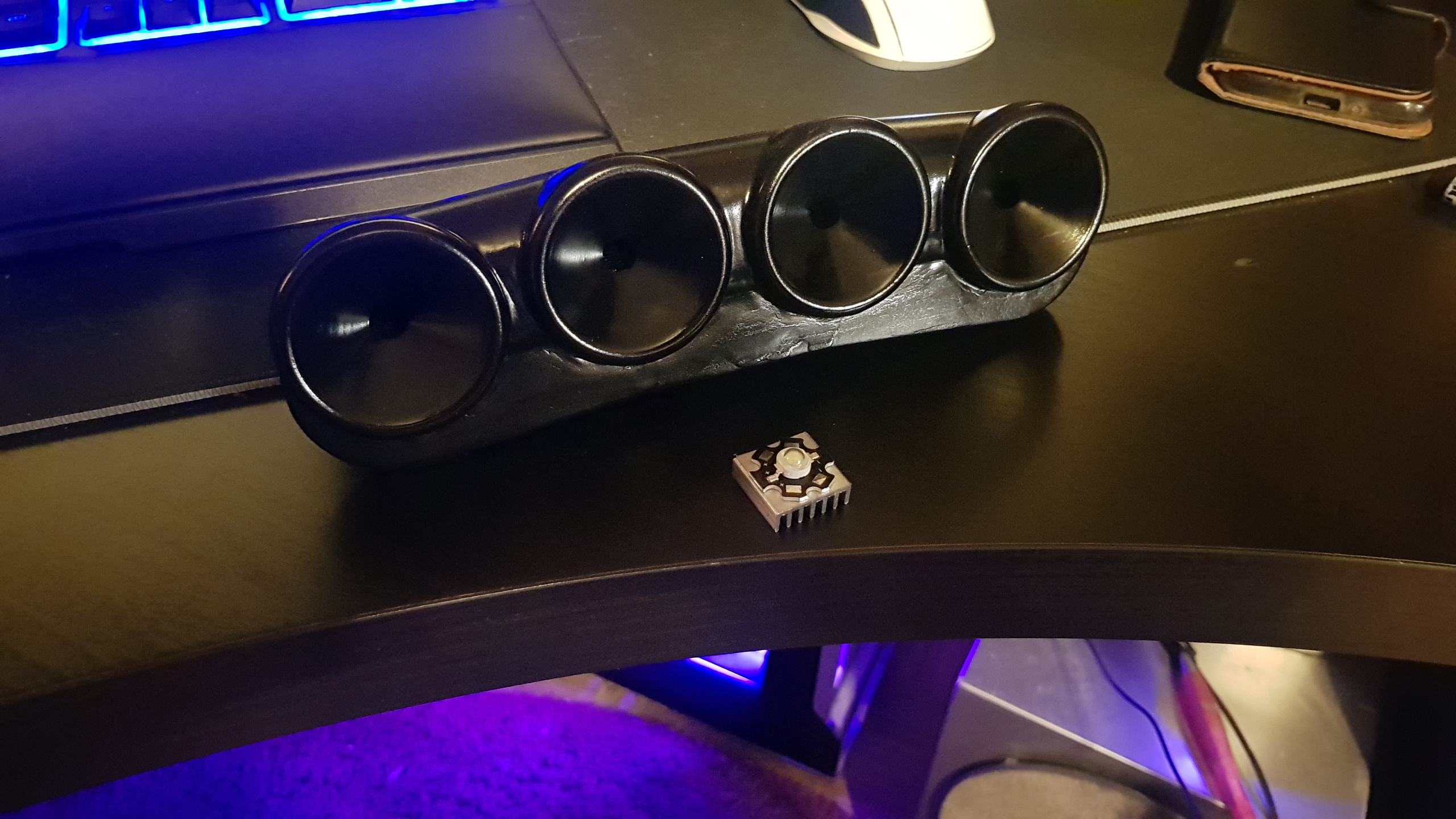 Blev lite dåligt med kräm i den gröna dioden i trianglen bara. Så blir det orange i den andra trianglen sen. Men börjar närma mig det läget att jag behöver få färg på karossen för att komma vidare, kan inte lödda på en massa långa kablar förrän de är på plats och man får rätt längder. Har en ny version av extraljus till denna med.