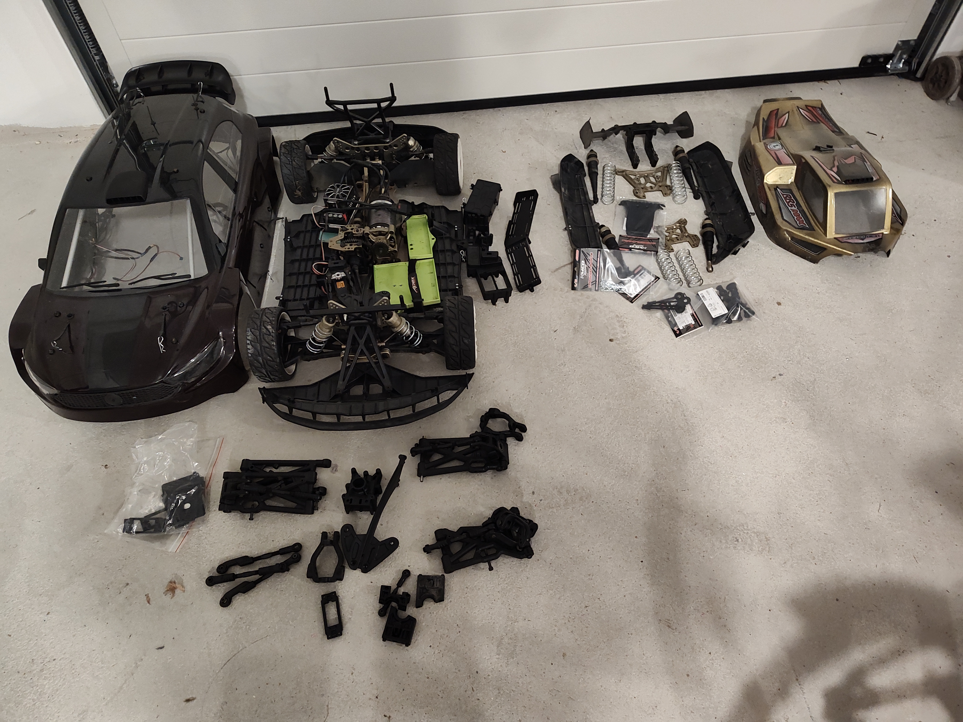 Det som saknas för rtr är batteri, mottagare och sändare, ev kan en futaba r334sbs-motagare köpas till. Även ett rr5-konverteringskit med sliten kaross kan köpas till om så önskas, till höger i bild.